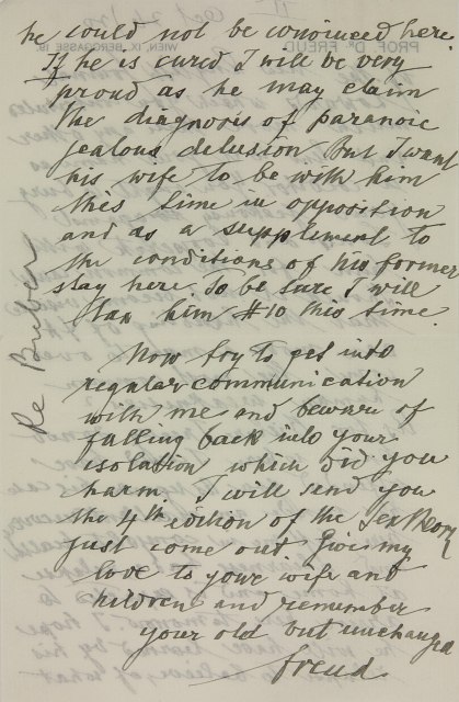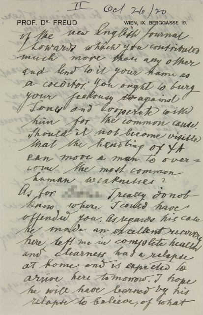 Das erste Blatt dieses Briefes (doppelseitig beschrieben) ist verloren gegangen. Dem Brief beigefügt ist eine entsprechende Notiz aus der Hand von Abraham A. Brill, die auf den Inhalt dieser verloren gegangenen Seiten Bezug nimmt. Die Qualität des Faksimiles ist nicht gut, man kann diesen Text nicht entziffern.] -