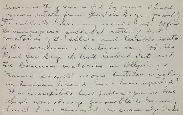 because the press is fed by news which comes entirely from London. As you probably know the cables to Germany are all cut. At first the newspapers published nothing but victories of the Allies and "terrible routs" [sic?] of the German & Austrian army. For the last few days the truth leaked out and the German victories in Belgium & France as well as one Austrian victory in Russian Poland have been reported. It is incredible how public opinion here which was always favorable to Germany should have changed so curiously. I was