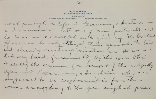 rash enough to defend Germany & Austria in a discussion with one of my patients and he became so enraged as to give up the treatment. Of course he only utilized this episode to bring out already existing resistances. He was hit very hard financially by the war. This is really the cause for most of the antipathy against Germany & Austria who are supposed to be responsible for this war - according to the pro-english press.