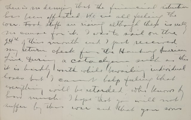 There is no denying that the financial situation has been affected. We are all feeling the war. Food stuffs are rising although there is really no cause for it. I was to sail on the 24th of this month and I just received my return check for the Hamburg American Line. During a cataclysm such as this it is hardly worth while bewailing individual loses [sic] but I cannot help feeling that everything will be retarded, who knows by how much. I hope that you will not suffer by this war and that your sons