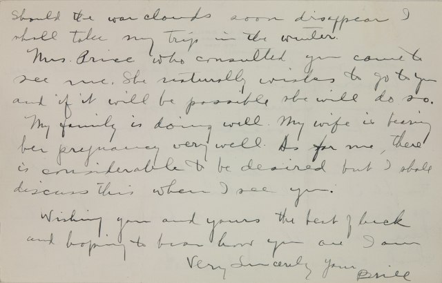 My family is doing well. My wife is bearing her pregnancy very well. As for me, there is considerable to be desired but I shall discuss this when I see you.