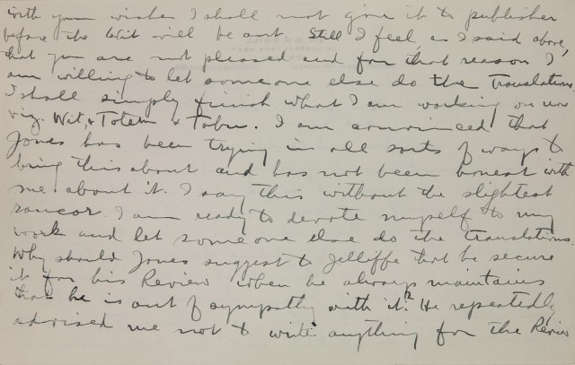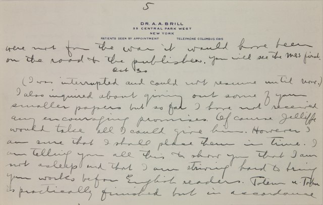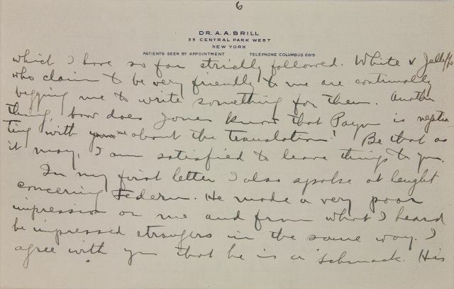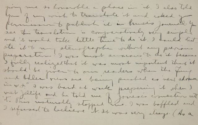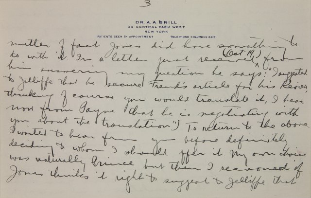 matter of fact Jones did have something to do with it.  In a letter just received (Oct 19) from him answering my question he says: AI suggested to Jelliffe that he secure Freud's article for his Review, thinking of course you would translate it, I hear now from Payne that he is negotiating with you about the translation")  To return to the above.  I waited to hear from you before definitely deciding to whom I should offer it.  My own choice was naturally Prince but then I reasoned if Jones thinks it right to suggest to Jelliffe that