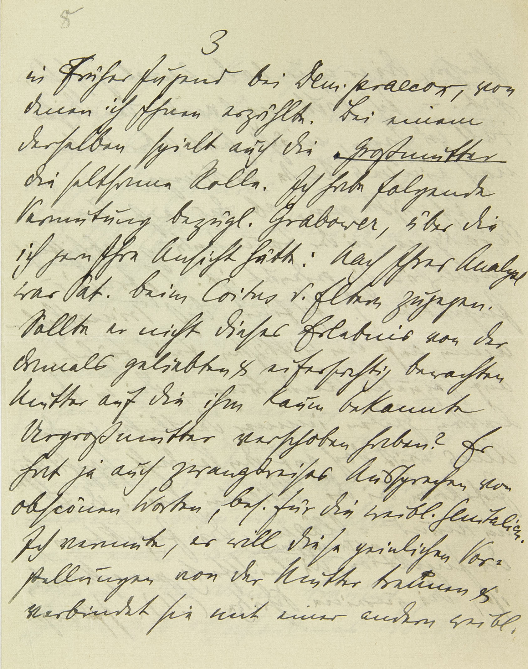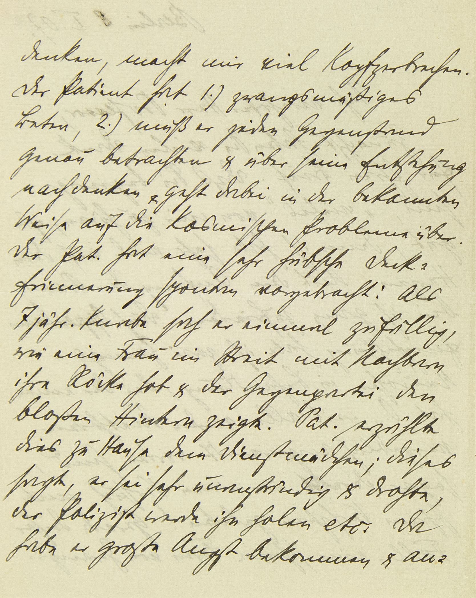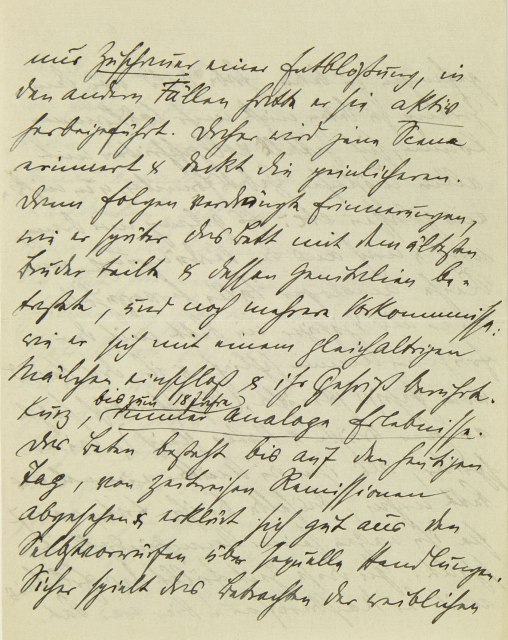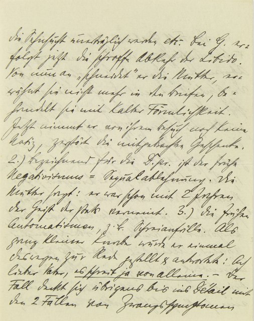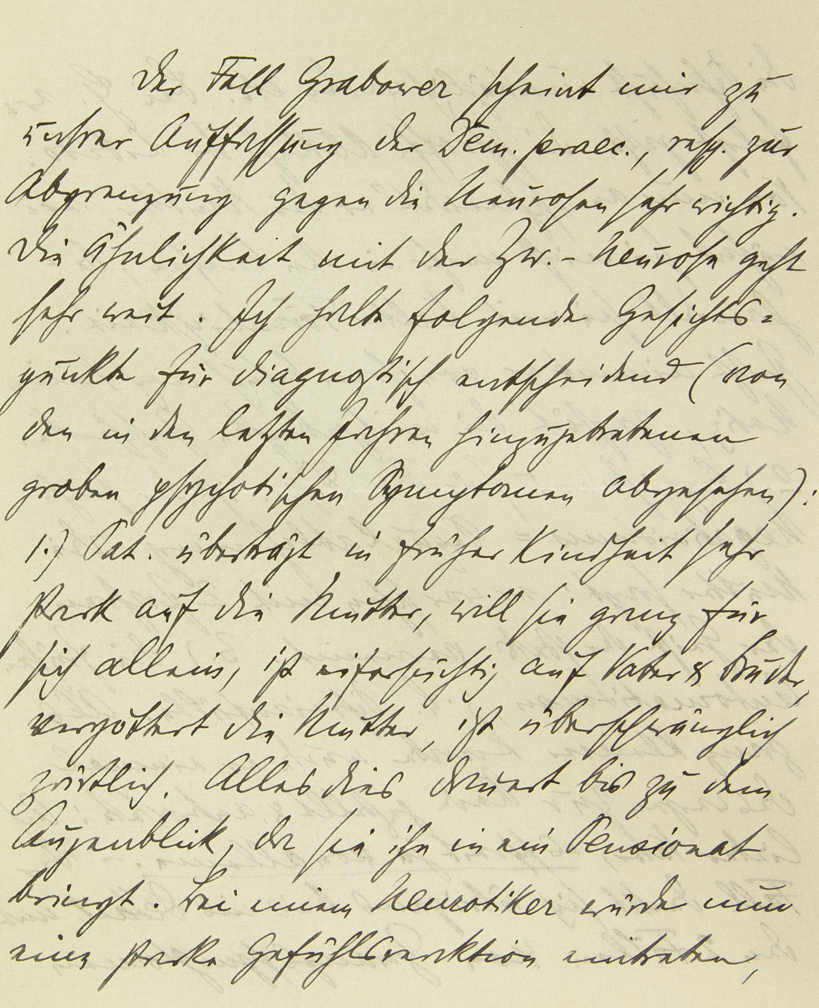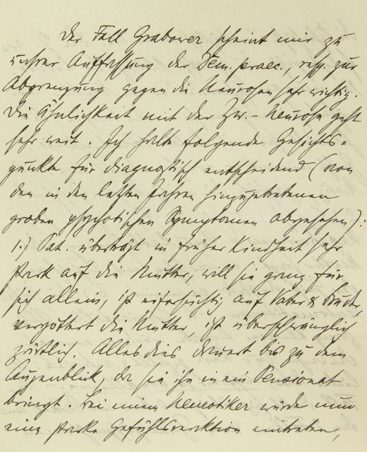 Der Fall Grabower scheint mir zu unsrer Auffassung der Dementia praecox, resp. zur Abgrenzung gegen die Neurosen, sehr wichtig. Die Ähnlichkeit mit der Zwangsneurose geht sehr weit. Ich halte folgende Gesichtspunkte für diagnostisch entscheidend (von den in den letzten Jahren hinzugetretenen groben psychotischen Symptomen abgesehen): 1.) Pat. überträgt in früher Kindheit sehr stark auf die Mutter, will sie ganz für sich allein, ist eifersüchtig auf Vater und Bruder, vergöttert die Mutter, ist überschwänglich zärtlich. Alles dies dauert bis zu dem Augenblick, da sie ihn in ein Pensionat bringt. Bei einem Neurotiker würde nun eine starke Gefühlsreaktion eintreten,