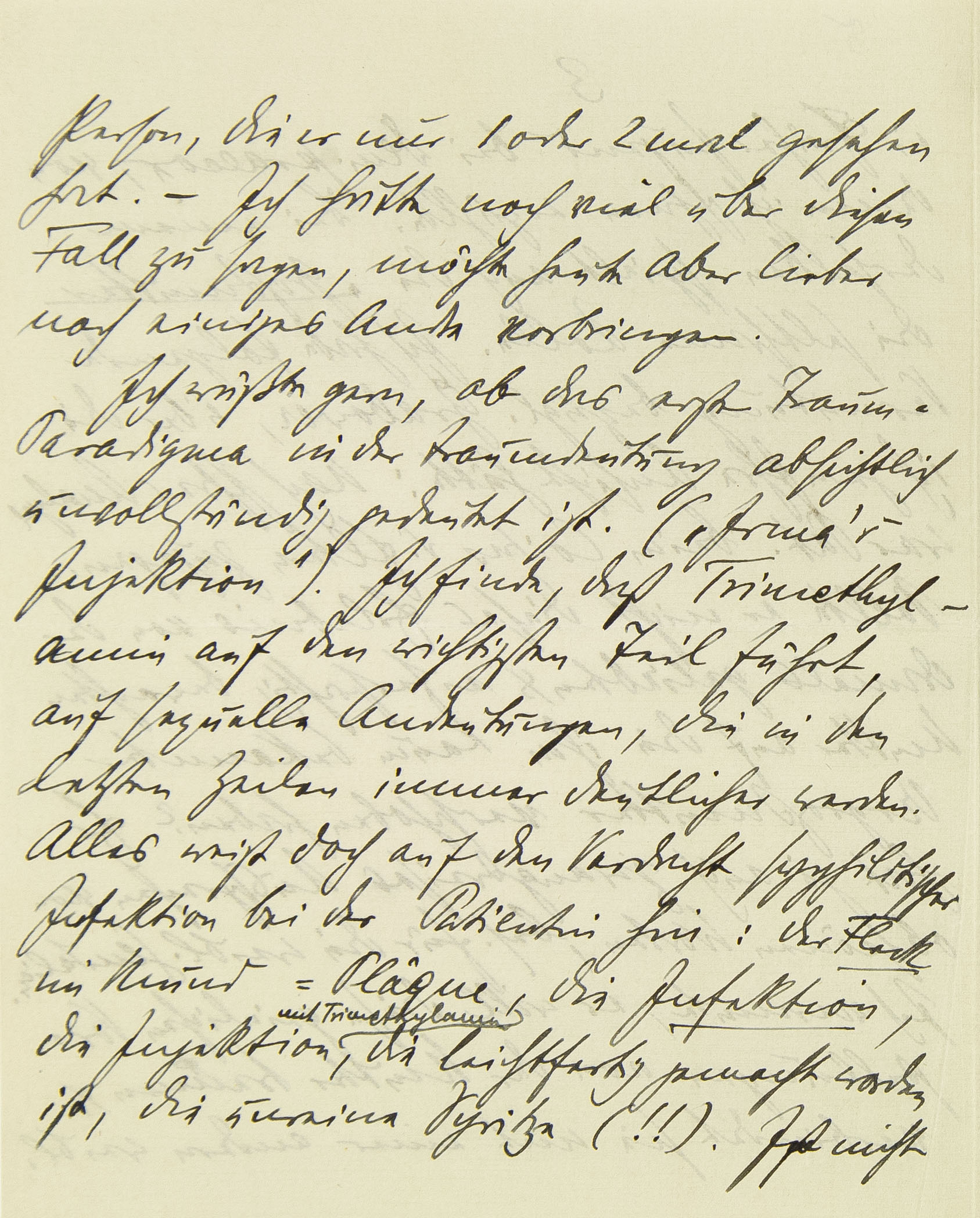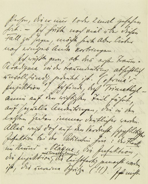 Person, die er nur ein- oder zweimal gesehen hat. – Ich hätte noch viel über diesen Fall zu sagen, möchte heute aber lieber noch einiges Andre vorbringen.Ich wüßte gern, ob das erste Traum-Paradigma in der Traumdeutung absichtlich unvollständig gedeutet ist. (»Irmas Injektion«). Ich finde, daß Trimethylamin auf den wichtigsten Teil führt, auf sexuelle Andeutungen, die in den letzten Zeilen immer deutlicher werden. Alles weist doch auf den Verdacht syphilitischer Infektion bei der Patientin hin: der Fleck im Mund = Plâque, die Infektion, die Injektion mit TrimethylaminC, die leichtfertig gemacht worden ist, die unreine Spritze (!!). Ist nicht