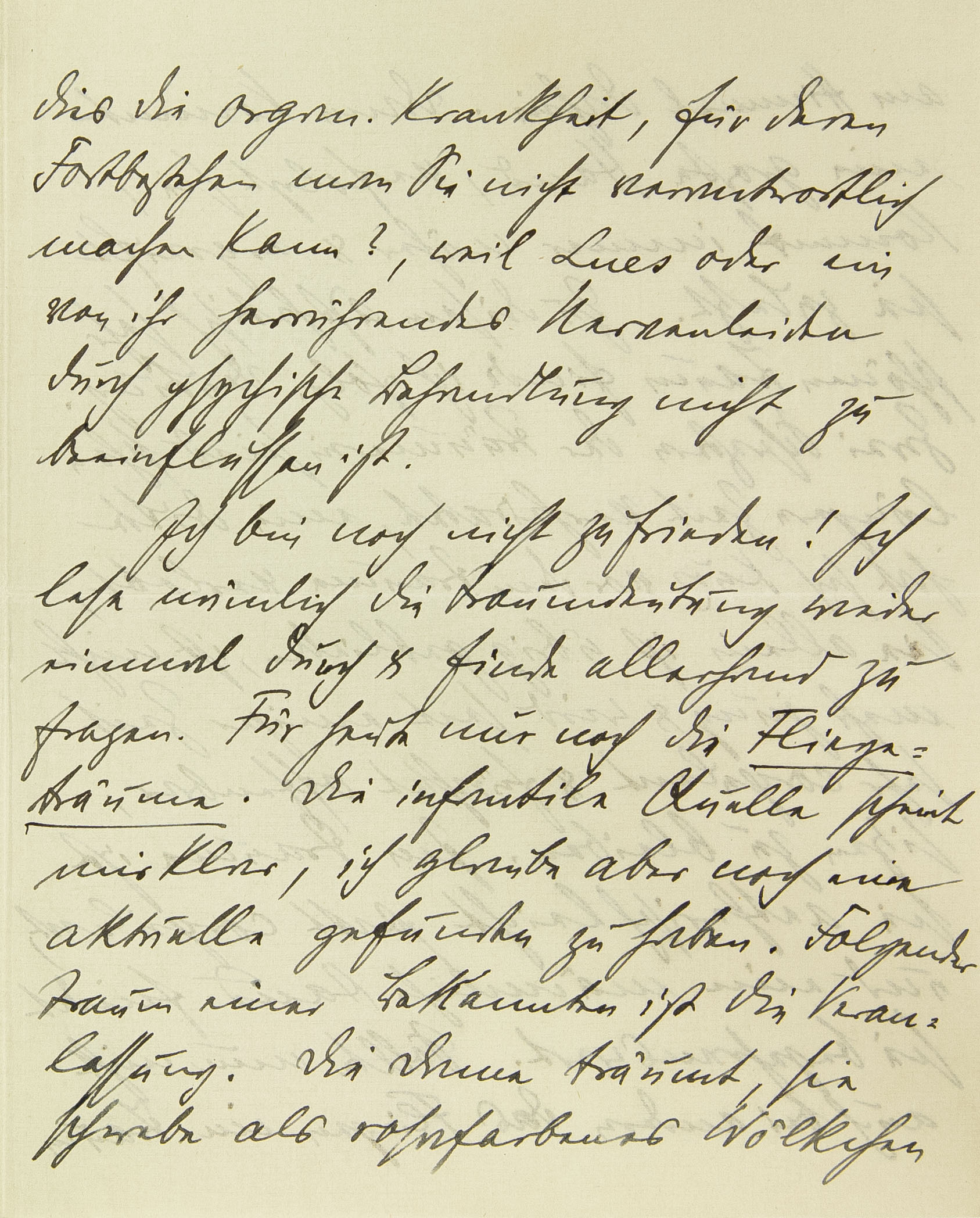 dies die organische Krankheit, für deren Fortbestehen man Sie nicht verantwortlich machen kann?, weil Lues oder ein von ihr herrührendes Nervenleiden durch psychische Behandlung nicht zu beeinflussen ist. Ich bin noch nicht zufrieden! Ich lese nämlich die Traumdeutung wieder einmal durch und finde allerhand zu fragen. Für heute nur noch die Fliegeträume. Die infantile Quelle scheint mir klar, ich glaube aber noch eine aktuelle gefunden zu haben. Folgender Traum einer Bekannten ist die Veranlassung. Die Dame träumt, sie schwebe als rosafarbenes Wölkchen