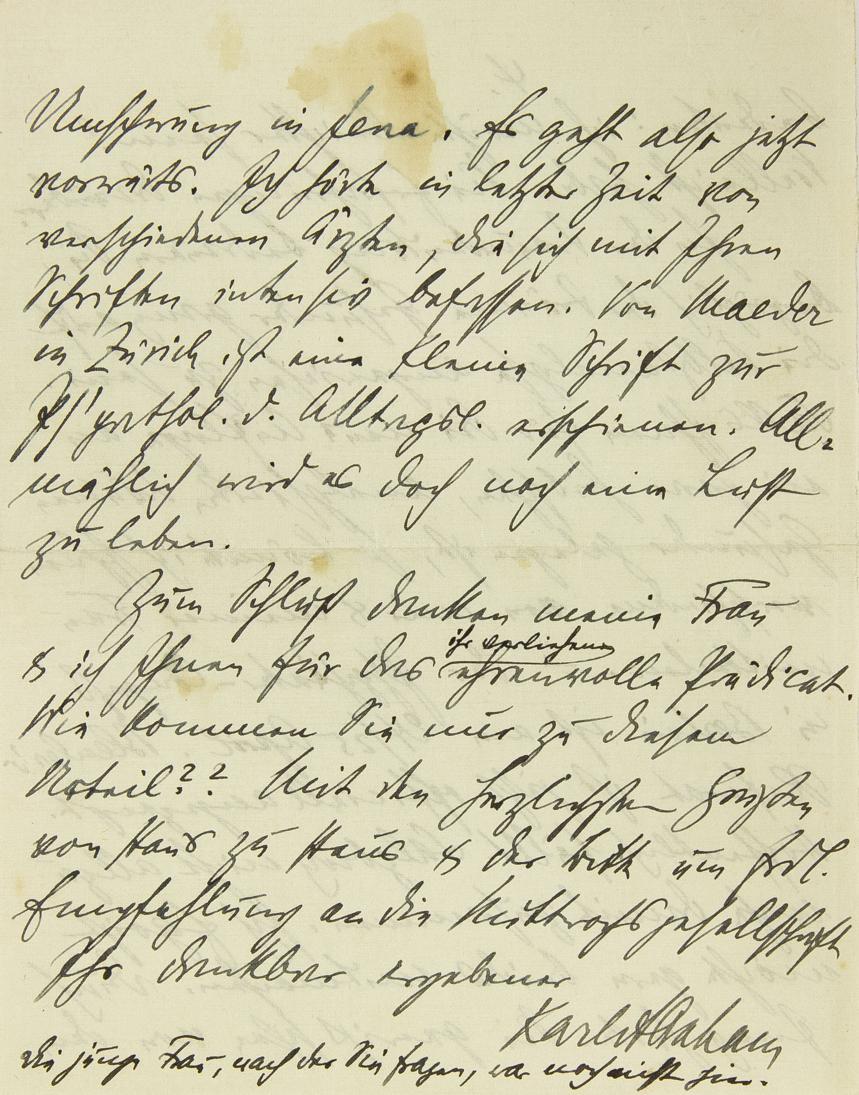 Umschwung in Jena. Es geht also jetzt vorwärts. Ich hörte in letzter Zeit von verschiedenen Ärzten, die sich mit Ihren Schriften intensiv befassen. Von Maeder in Zürich ist eine kleine Schrift zur Psychopathologie des Alltagslebens erschienen. Allmählich wird es doch noch eine Lust zu leben. Zum Schluß danken meine Frau und ich Ihnen für das ihr erliehene ehrenvolle Prädikat. Wie kommen Sie nur zu diesem Urteil?? Mit den herzlichsten Grüßen von Haus zu Haus und der Bitte um freundliche Empfehlung an die Mittwochsgesellschaft.