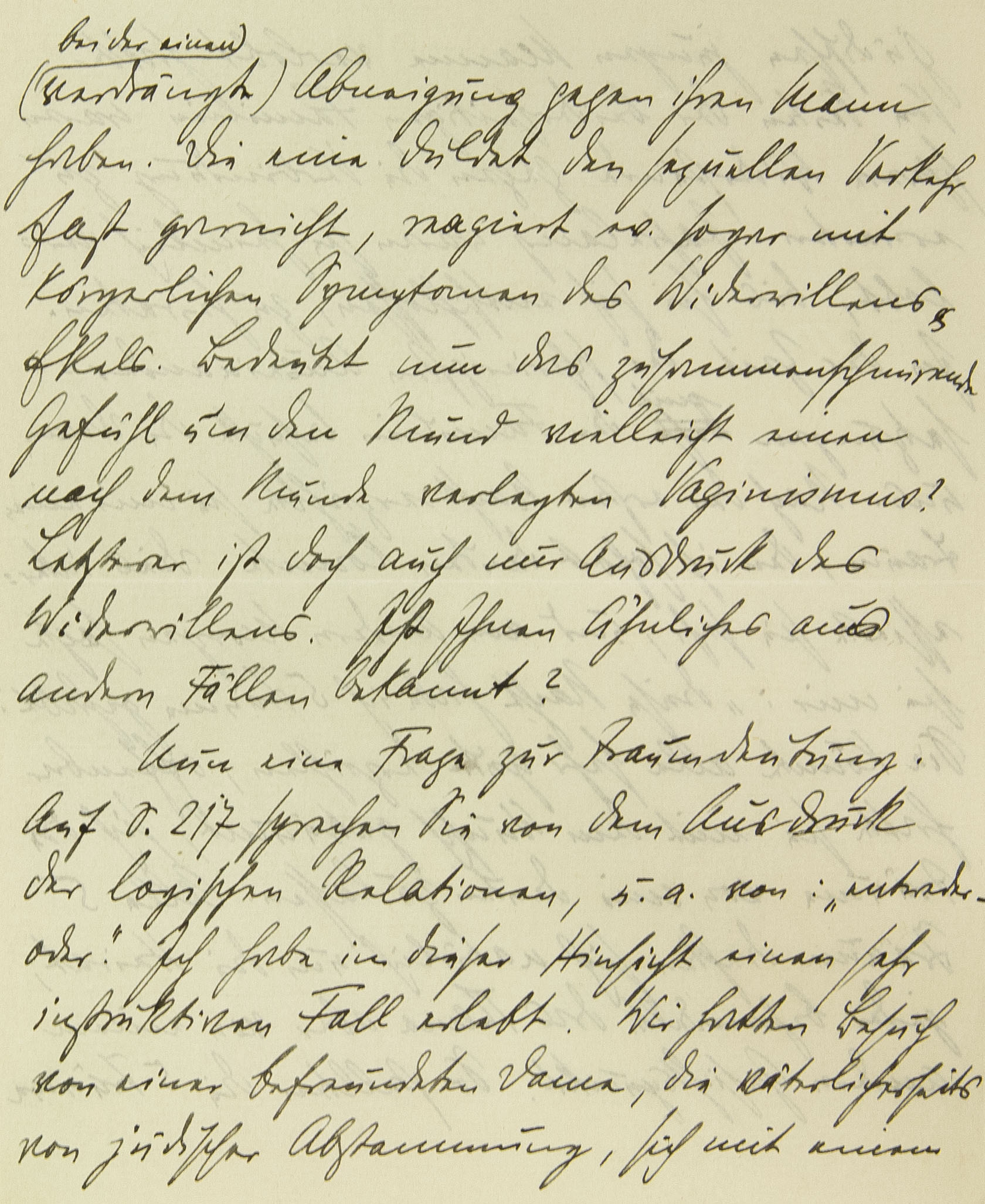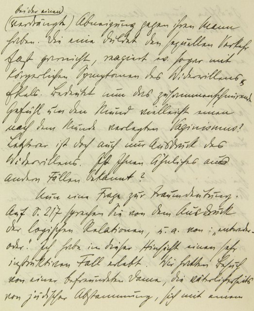 (bei der einen verdrängte) Abneigung gegen ihren Mann haben. Die eine duldet den sexuellen Verkehr fast gar nicht, reagiert eventuell sogar mit körperlichen Symptomen des Widerwillens und Ekels. Bedeutet nun das zusammenschnürende Gefühl um den Mund vielleicht einen nach dem Munde verlegten Vaginismus? Letzterer ist doch auch nur Ausdruck des Widerwillens. Ist Ihnen Ähnliches aus andern Fällen bekannt? Nun eine Frage zur Traumdeutung. Auf S. 217 sprechen Sie von dem Ausdruck der logischen Relationen, u.a. von: »entweder - oder«. Ich habe in dieser Hinsicht einen sehr instruktiven Fall erlebt. Wir hatten Besuch von einer befreundeten Dame, die, väterlicherseits von jüdischer Abstammung, sich mit einem