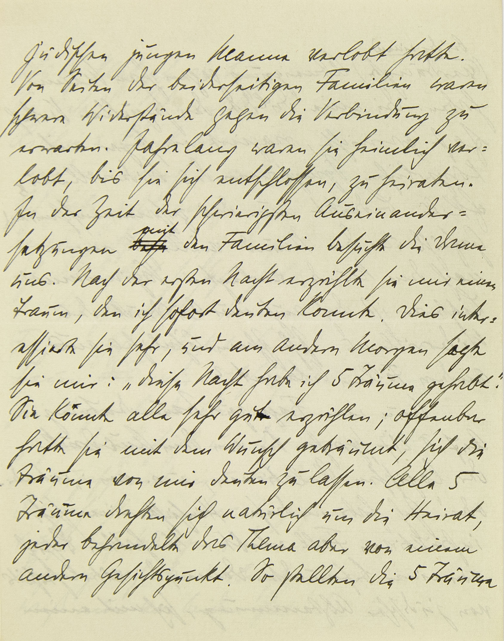 jüdischen jungen Manne verlobt hatte. Von Seiten der beiderseitigen Familien waren schwere Widerstände gegen die Verbindung zu erwarten. Jahrelang waren sie heimlich verlobt, bis sie sich entschlossen zu heiraten. In der Zeit der schwierigsten Auseinandersetzung mit den Familien besuchte die Dame uns. Nach der ersten Nacht erzählte sie mir einen Traum, den ich sofort deuten konnte. Dies interessierte sie sehr, und am andern Morgen sagte sie mir: »Diese Nacht habe ich fünf Träume gehabt«. Sie konnte sie alle sehr gut erzählen; offenbar hatte sie mit dem Wunsch geträumt, sich die Träume von mir deuten zu lassen. Alle fünf Träume drehten sich natürlich um die Heirat, jeder behandelte das Thema aber von einem andern Gesichtspunkt. So stellten die fünf Träume