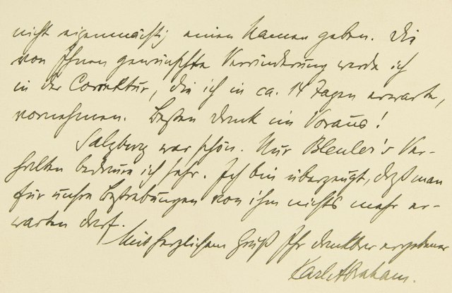 nicht eigenmächtig einen Namen geben. Die von Ihnen gewünschte Veränderung werde ich in der Korrektur, die ich in ca. 14 Tagen erwarte, vornehmen. Besten Dank im voraus! Salzburg war schön. Nur Bleulers Verhalten bedaure ich sehr. Ich bin überzeugt, daß man für unsre Bestrebungen von ihm nichts mehr erwarten darf. Mit herzlichem Gruß Ihr dankbar ergebener