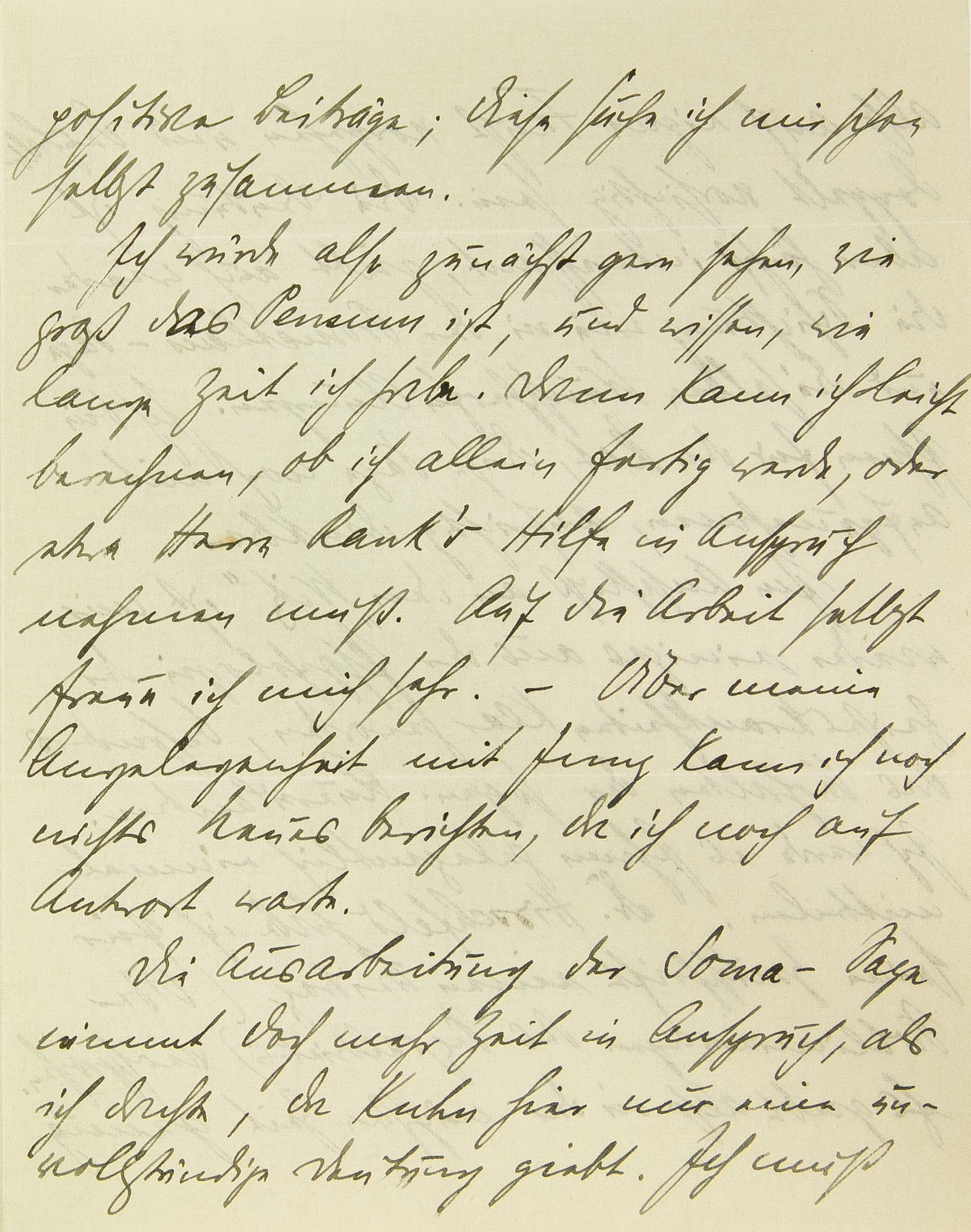 positive Beiträge; diese suche ich mir schon selbst zusammen. Ich würde also zunächst gern sehen, wie groß das Pensum ist, und wissen, wie lange Zeit ich habe. Dann kann ich leicht berechnen, ob ich allein fertig werde, oder etwa Herrn Ranks Hilfe in Anspruch nehmen muß. Auf die Arbeit selbst freue ich mich sehr. – Über meine Angelegenheit mit Jung kann ich noch nichts Neues berichten, da ich noch auf Antwort warte. Die Ausarbeitung der Soma-Sage nimmt doch mehr Zeit in Anspruch, als ich dachte, da Kuhn hier nur eine unvollständige Deutung gibt. Ich muß