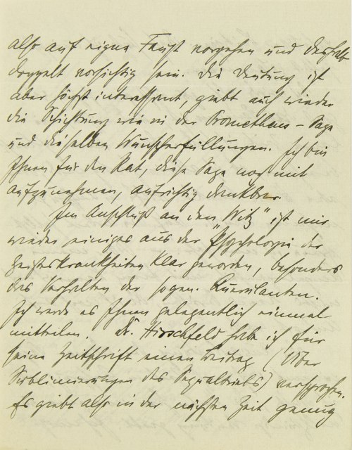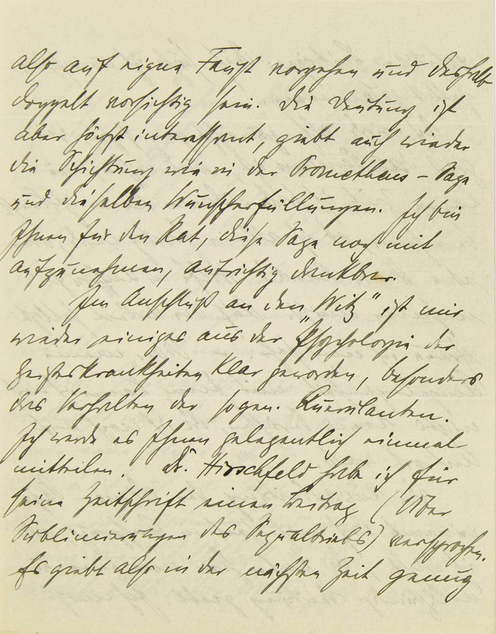 also auf eigne Faust vorgehen und deshalb doppelt vorsichtig sein. Die Deutung ist aber höchst interessant, gibt auch wieder die Schichtung wie in der Prometheus-Sage und dieselben Wunscherfüllungen. Ich bin Ihnen für den Rat, diese Sage noch mit aufzunehmen, aufrichtig dankbar. Im Anschluß an den »Witz« ist mir wieder einiges aus der Psychologie der Geisteskrankheiten klar geworden, besonders das Verhalten der sogenannten Querulanten. Ich werde es Ihnen gelegentlich einmal mitteilen. Dr. Hirschfeld habe ich für seine Zeitschrift einen Beitrag (Über Sublimierungen des Sexualtriebs) versprochen. Es gibt also in der nächsten Zeit genug