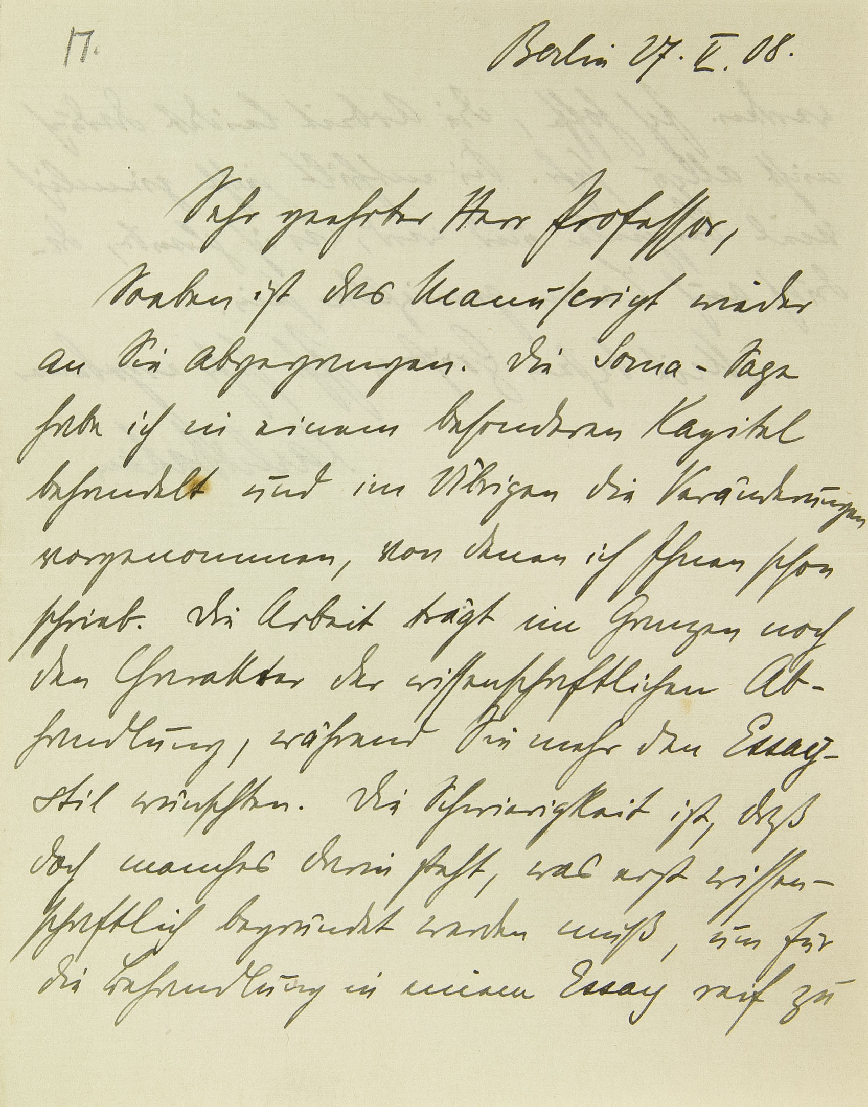Soeben ist das Manuskript wieder an Sie abgegangen. Die Soma-Sage habe ich in einem besonderen Kapitel behandelt und im übrigen die Veränderungen vorgenommen, von denen ich Ihnen schon schrieb. Die Arbeit trägt im Ganzen noch den Charakter der wissenschaftlichen Abhandlung, während Sie mehr den Essaystil wünschten. Die Schwierigkeit ist, daß doch manches darin steht, was erst wissenschaftlich begründet werden muß, um für die Behandlung in einem Essay reif