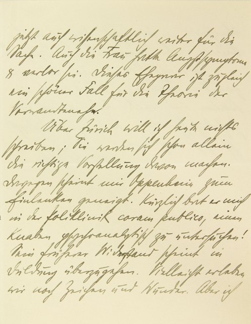 jetzt auch wissenschaftlich weiter für die Sache. Auch die Frau hatte Angstsymptome und verlor sie. Dieses Ehepaar ist zugleich ein schöner Fall für die Theorie der Verwandtenehe. Über Zürich will ich heute nichts schreiben; Sie werden sich schon allein die richtige Vorstellung davon machen. Dagegen scheint mir Oppenheim zum Einlenken geneigt. Kürzlich bat er mich in der Poliklinik coram publico, einen Knaben psychoanalytisch zu untersuchen! Sein früherer Widerstand scheint in Duldung überzugehen. Vielleicht erleben wir noch Zeichen und Wunder. Aber ich