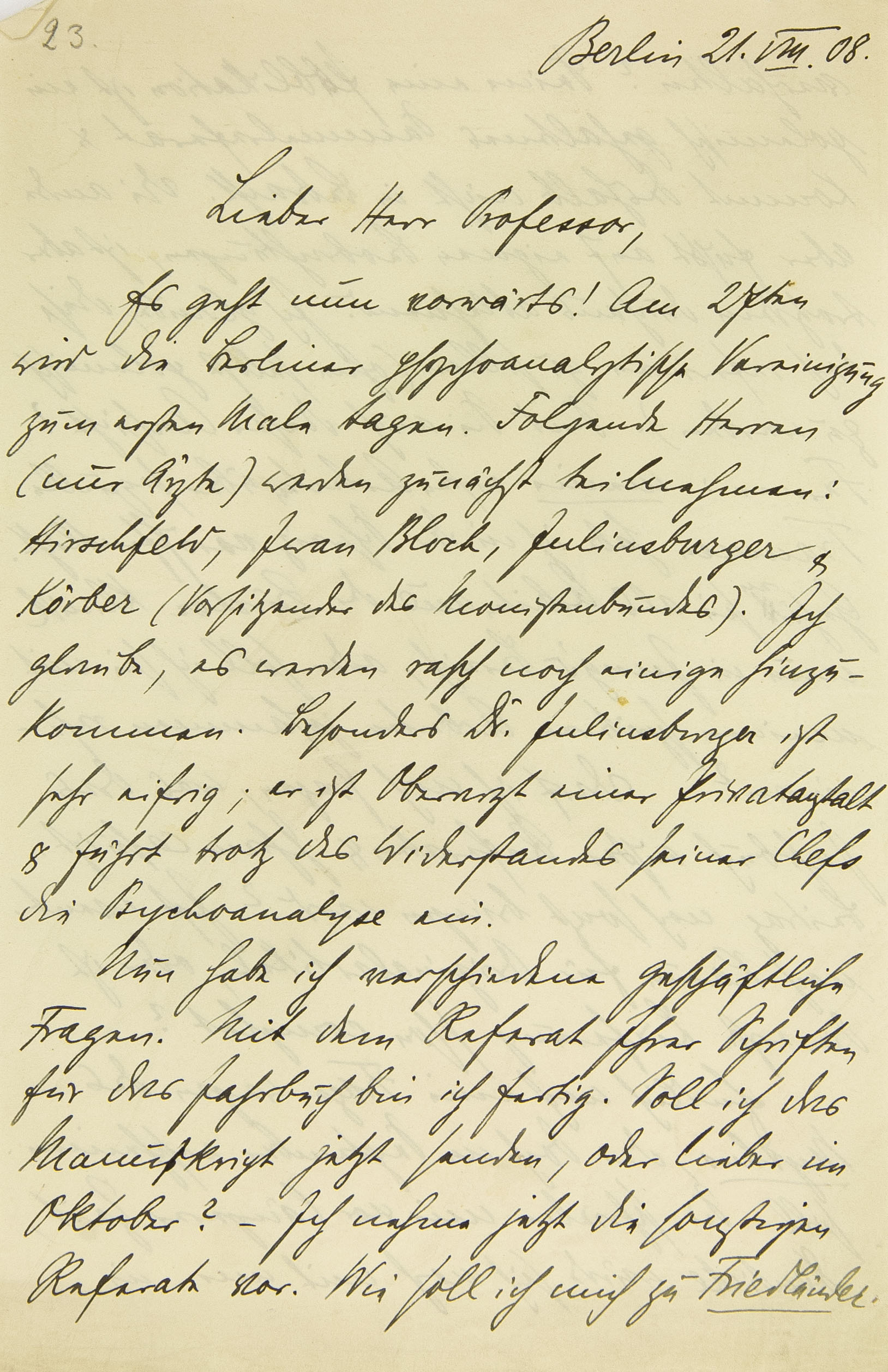 Es geht nun vorwärts! Am 27. wird die Berliner Psychoanalytische Vereinigung zum ersten Male tagen. Folgende Herren (nur Ärzte) werden zunächst teilnehmen: Hirschfeld, Iwan Bloch, Ju- liusburger und KoerberA (Vorsitzender des Monistenbundes). Ich glaube, es werden rasch noch einige hinzukommen. Besonders Dr. Juliusburger ist sehr eifrig; er ist Oberarzt einer Privatanstalt und führt trotz des Widerstandes seiner Chefs die Psychoanalyse ein. Nun habe ich verschiedene geschäftliche Fragen. Mit dem Referat Ihrer Schriften für das Jahrbuch bin ich fertig. Soll ich das Manuskript jetzt senden, oder lieber im Oktober? – Ich nehme jetzt die sonstigen Referate vor. Wie soll ich mich zu Friedländer