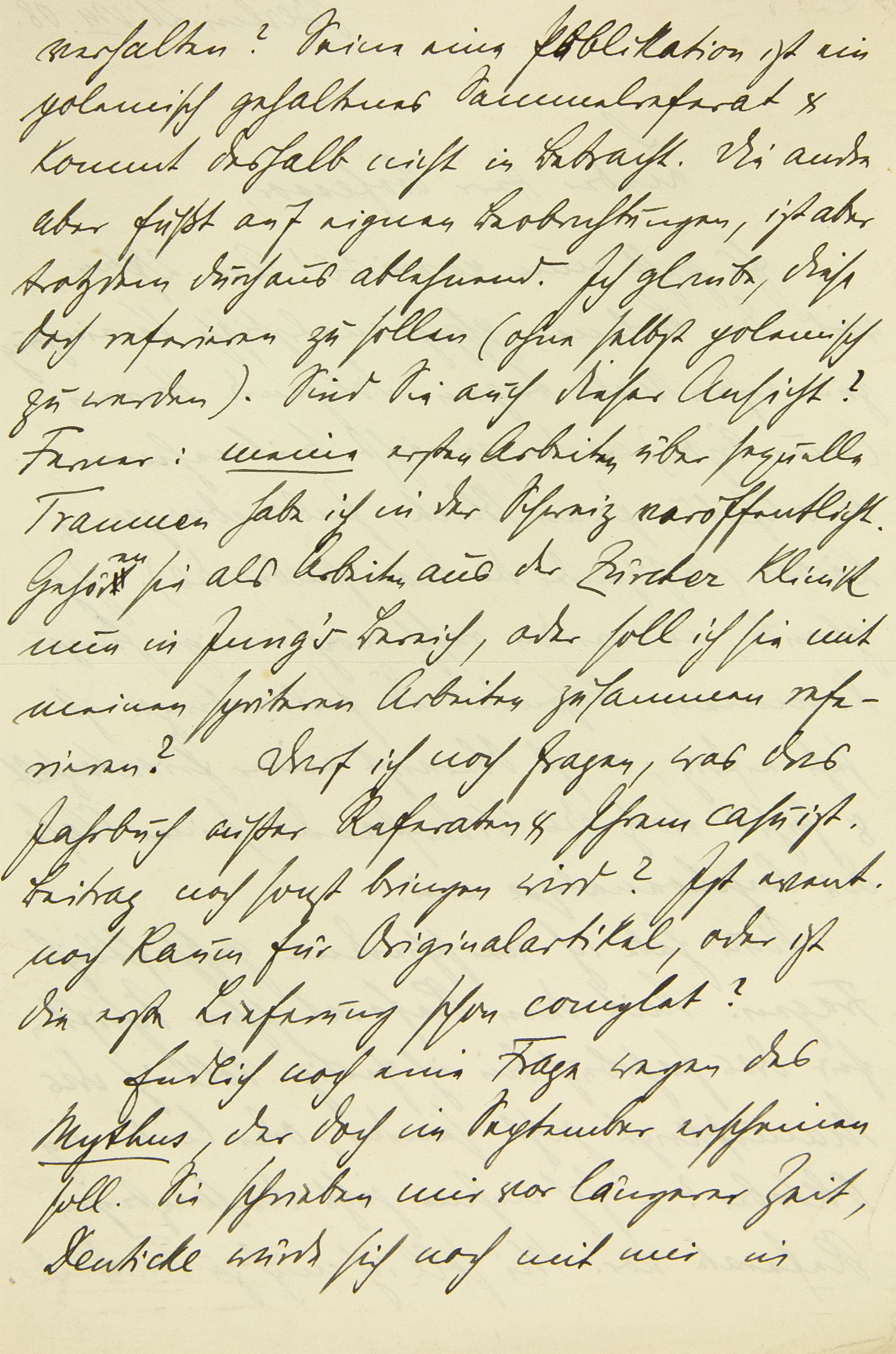 verhalten? Seine eine Publikation ist ein polemisch gehaltenes Sammelreferat und kommt deshalb nicht in Betracht. Die andere aber fußt auf eigenen Beobachtungen, ist aber trotzdem durchaus ablehnend. Ich glaube, diese doch referieren zu sollen (ohne selbst polemisch zu werden). Sind Sie auch dieser Ansicht? Ferner: meine ersten Arbeiten über sexuelle Traumen habe ich in der Schweiz veröffentlicht. Gehören sie als Arbeiten aus der Zürcher Klinik nun in Jungs Bereich, oder soll ich sie mit meinen späteren Arbeiten zusammen referieren? Darf ich noch fragen, was das Jahrbuch außer Referaten und Ihrem kasuistischen Beitrag noch sonst bringen wird? Ist eventuell noch Raum für Originalartikel, oder ist die erste Lieferung schon komplett? Endlich noch eine Frage wegen des Mythus, der doch im September erscheinen soll. Sie schrieben mir vor längerer Zeit, Deuticke würde sich noch mit mir in