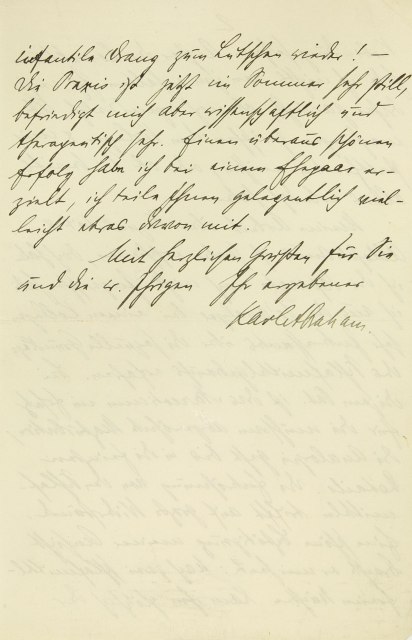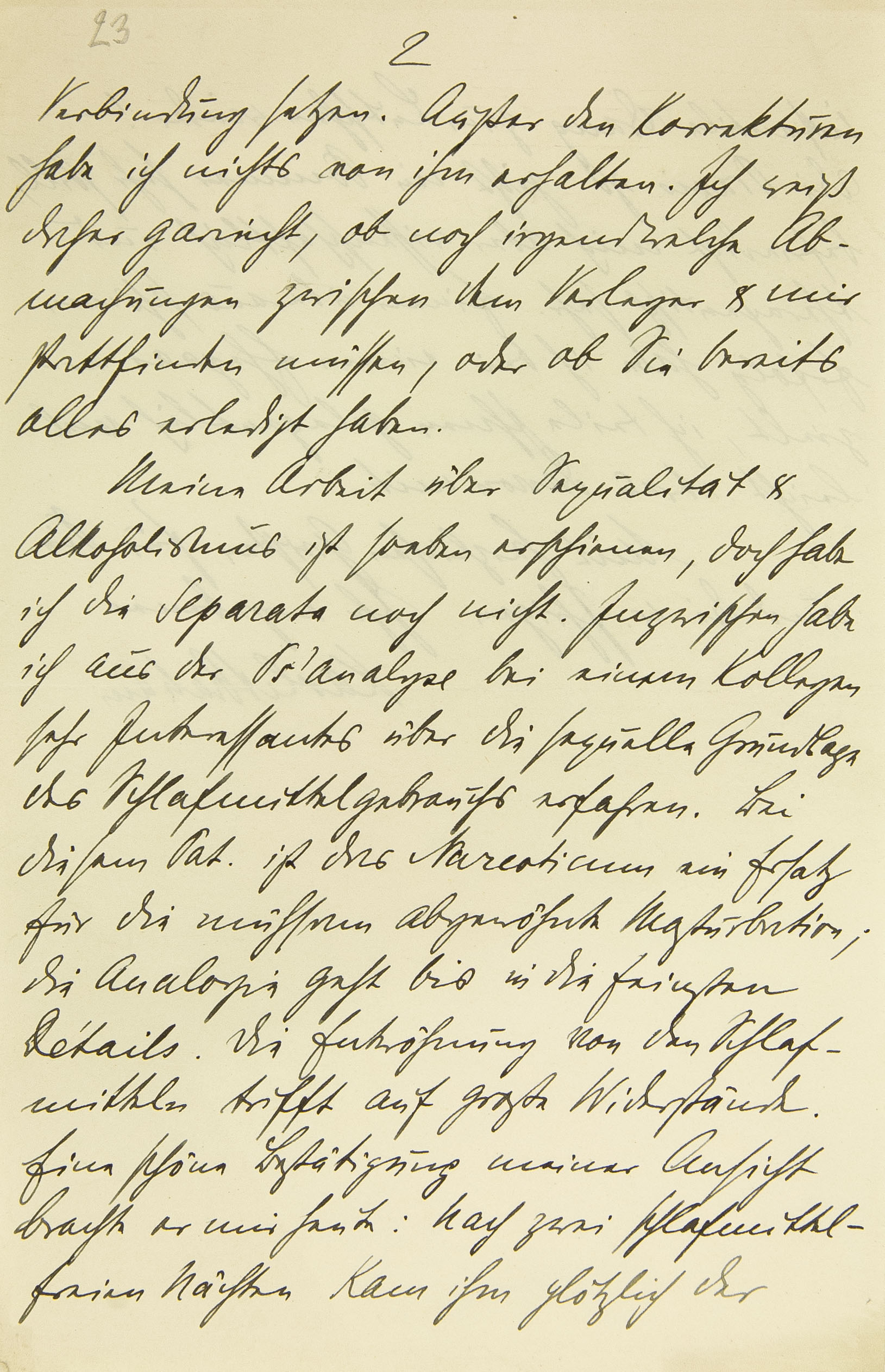 Verbindung setzen. Außer den Korrekturen habe ich nichts von ihm erhalten. Ich weiß daher gar nicht, ob noch irgendwelche Abmachungen zwischen dem Verleger und mir stattfinden müssen, oder ob Sie bereits alles erledigt haben. Meine Arbeit über Sexualität und Alkoholismus ist soeben erschienen, doch habe ich die Separata noch nicht. Inzwischen habe ich aus der Psychoanalyse bei einem Kollegen sehr Interes- santes über die sexuelle Grundlage des Schlafmittelgebrauchs erfahren. Bei diesem Pat. ist das Narkotikum ein Ersatz für die mühsam abgewöhnte Masturbation; die Analogie geht bis in die feinsten Details. Die Entwöhnung von den Schlafmitteln trifft auf große Widerstände. Eine schöne Bestätigung meiner Ansicht brachte er mir heute: Nach zwei schlafmittelfreien Nächten kam ihm plötzlich der