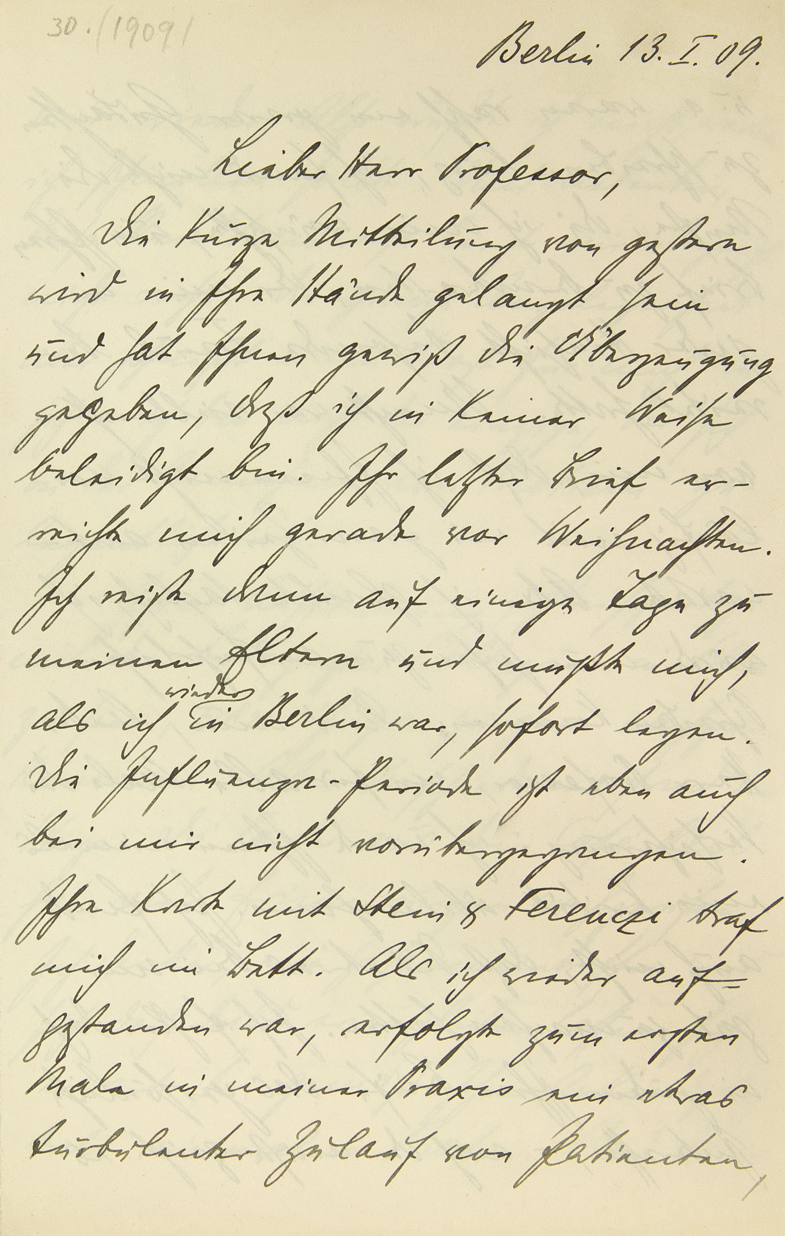 Die kurze Mitteilung von gestern wird in Ihre Hände gelangt sein und hat Ihnen gewiß die Überzeugung gegeben, daß ich in keiner Weise beleidigt bin. Ihr letzter Brief erreichte mich gerade vor Weihnachten. Ich reiste dann auf einige Tage zu meinen Eltern und mußte mich, als ich wieder in Berlin war, sofort legen. Die Influenza-Periode ist eben auch bei mir nicht vorübergegangen. Ihre Karte mit Stein und Ferenczi traf mich im Bett. Als ich wieder aufgestanden war, erfolgte zum ersten Male in meiner Praxis ein etwas turbulenter Zulauf von Patienten,