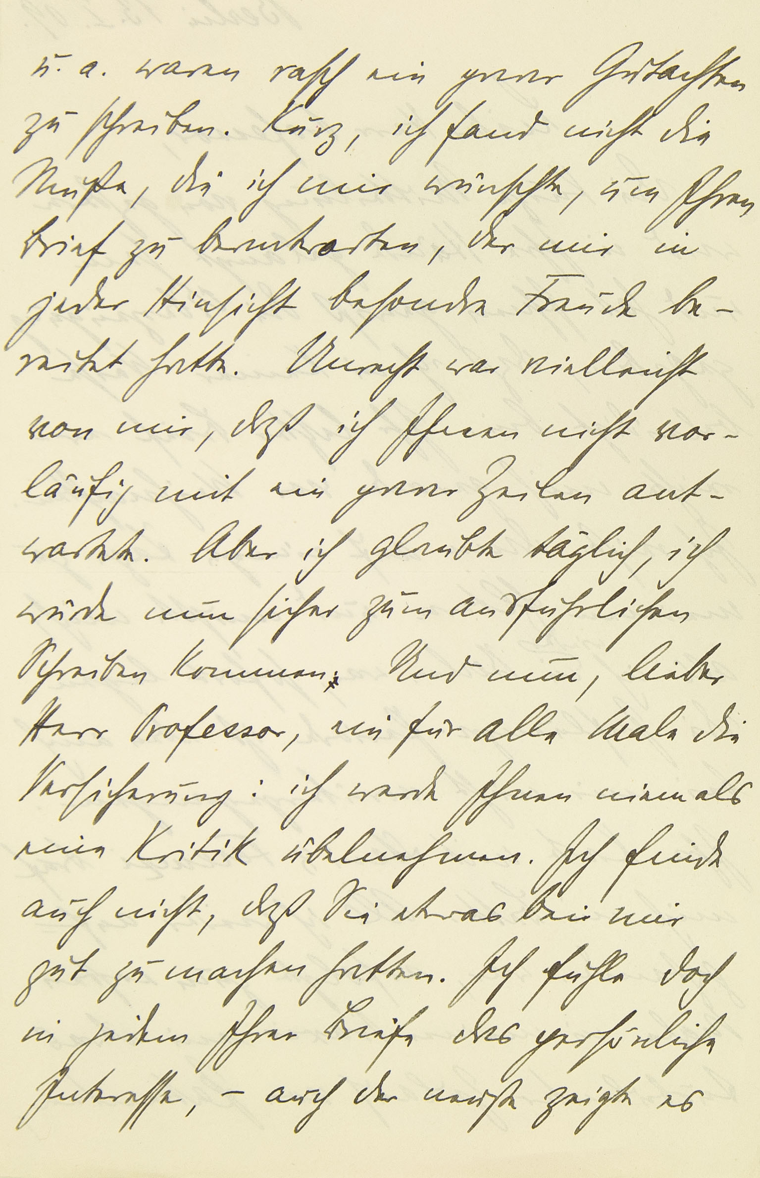 u.a. waren rasch ein paar Gutachten zu schreiben. Kurz, ich fand nicht die Muße, die ich mir wünschte, um Ihren Brief zu beantworten, der mir in jeder Hinsicht besondre Freude bereitet hatte. Unrecht war vielleicht von mir, daß ich Ihnen nicht vorläufig mit ein paar Zeilen antwortete. Aber ich glaubte täglich, ich würde nun sicher zum ausführlichen Schreiben kommen. Und nun, lieber Herr Professor, ein für alle Male die Versicherung: ich werde Ihnen niemals eine Kritik übelnehmen. Ich finde auch nicht, daß Sie etwas bei mir gut zu machen hatten. Ich fühle doch in jedem Ihrer Briefe das persönliche Interesse – auch der neuste zeigte es