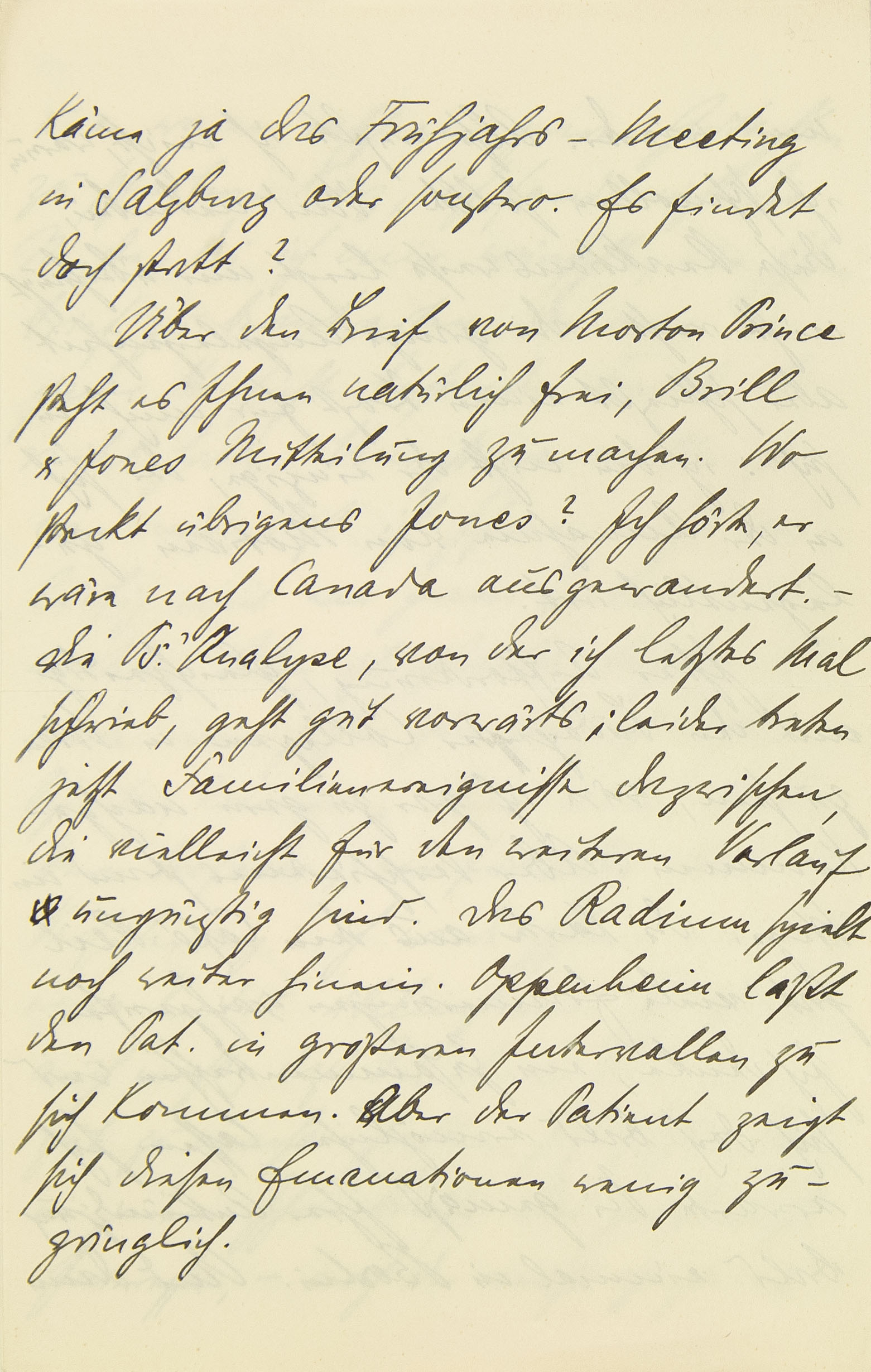 käme ja das Frühjahrs-Meeting in Salzburg oder sonstwo. Es findet doch statt? Über den Brief von Morton Prince steht es Ihnen natürlich frei, Brill und Jones Mitteilung zu machen. Wo steckt übrigens Jones? Ich hörte, er wäre nach Kanada ausgewandert. – Die Psychoanalyse, von der ich letztes Mal schrieb, geht gut vorwärts; leider treten jetzt Familienereignisse dazwischen, die vielleicht für den weiteren Verlauf ungünstig sind. Das Radium spielt noch weiter hinein. Oppenheim läßt den Pat. in größeren Intervallen zu sich kommen. Aber der Patient zeigt sich in diesen Emanationen wenig zugänglich.