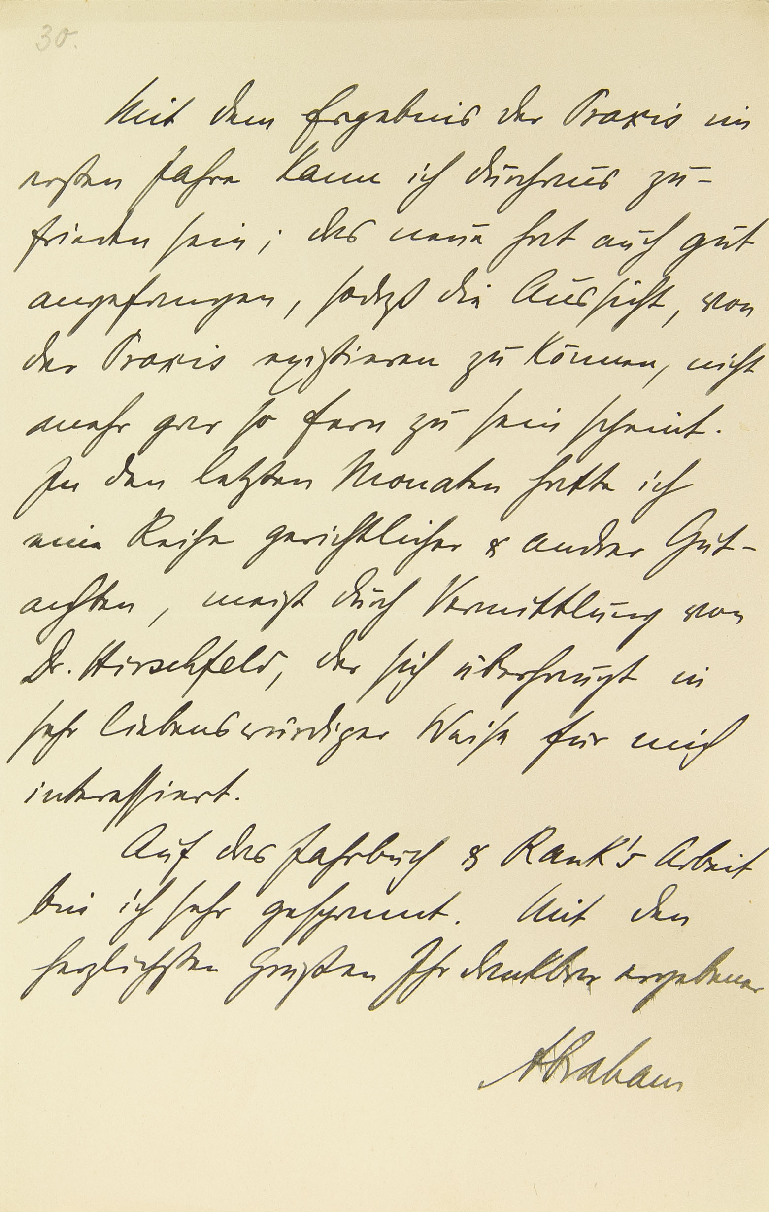 Mit dem Ergebnis der Praxis im ersten Jahre kann ich durch- aus zufrieden sein; das neue hat auch gut angefangen, sodaß die Aussicht, von der Praxis existieren zu können, nicht mehr gar so fern zu sein scheint. In den letzten Monaten hatte ich eine Reihe gerichtlicher und andrer Gutachten, meist durch Vermittlung von Dr. Hirschfeld, der sich überhaupt in sehr liebenswürdiger Weise für mich interessiert. Auf das Jahrbuch und Ranks Arbeit bin ich sehr gespannt. Mit den herzlichsten Grüßen Ihr dankbar ergebener