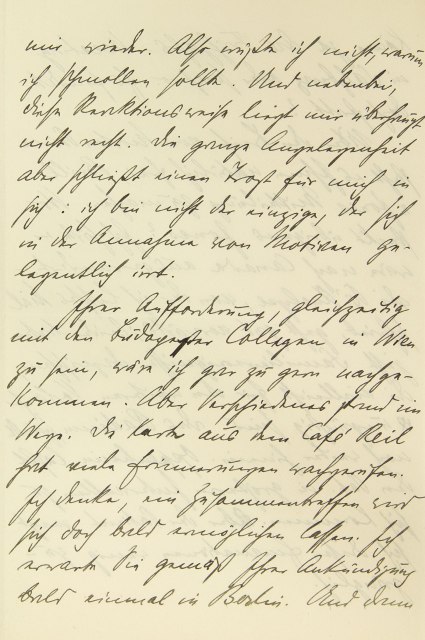 mir wieder. Also wüßte ich nicht, warum ich schmollen sollte. Und nebenbei, diese Reaktionsweise liegt mir überhaupt nicht recht. Die ganze Angelegenheit aber schließt einen Trost für mich in sich: ich bin nicht der einzige, der sich in der Annahme von Motiven gelegentlich irrt. Ihrer Aufforderung, gleichzeitig mit den Budapester Kollegen in Wien zu sein, wäre ich gar zu gern nachgekommen. Aber Verschiedenes stand im Wege. Die Karte aus dem Café Riedl hat viele Erinnerungen wachgerufen. Ich denke, ein Zusammentreffen wird sich doch bald ermöglichen lassen. Ich erwarte Sie gemäß Ihrer Ankündigung bald einmal in Berlin. Und dann
