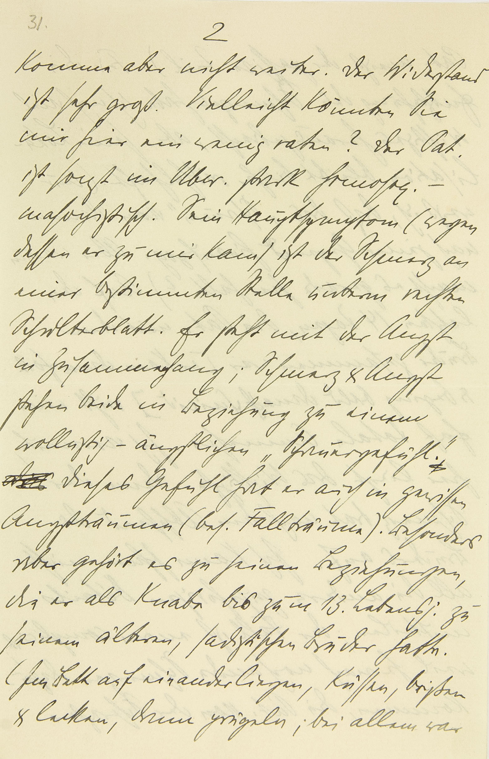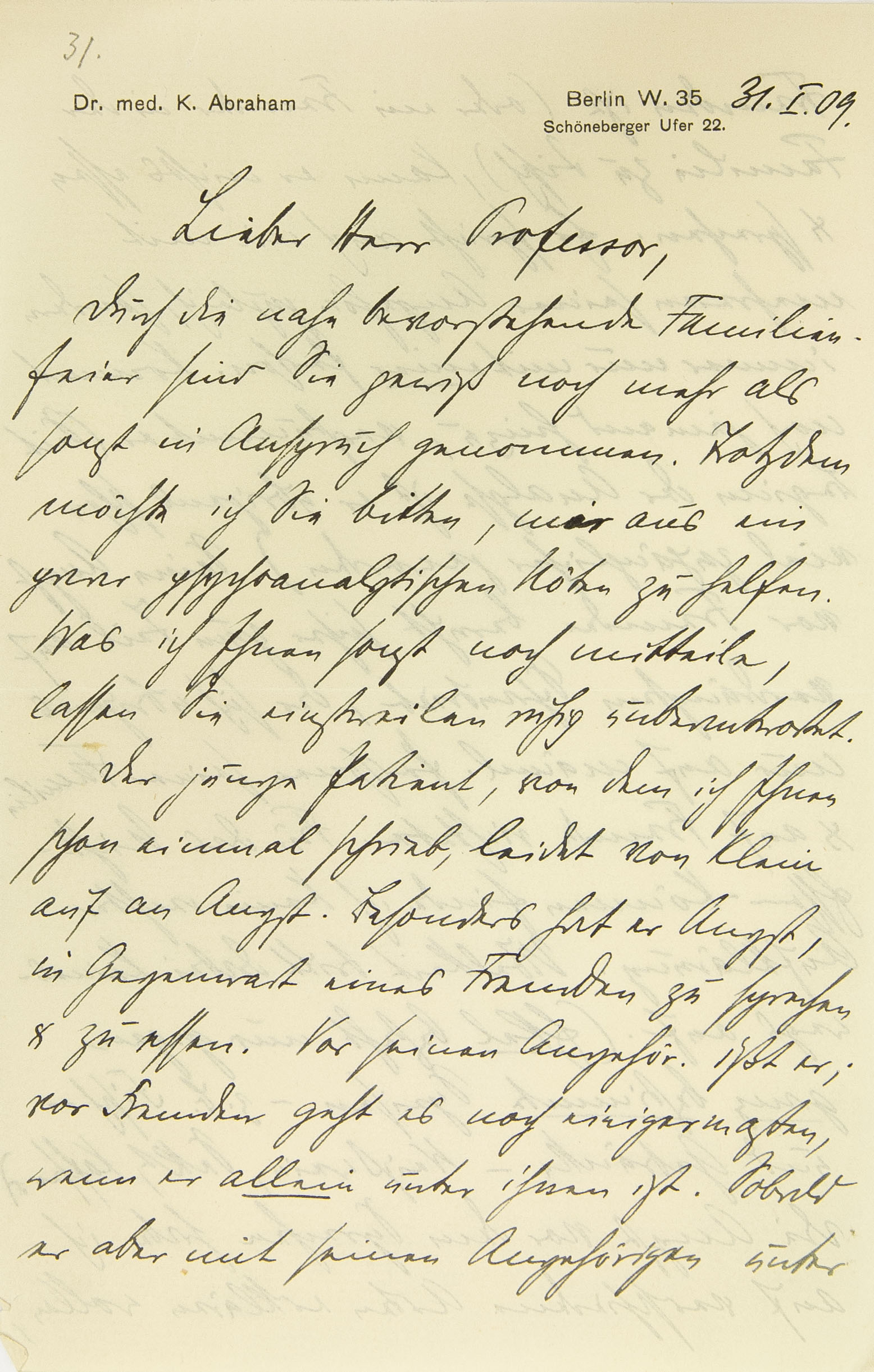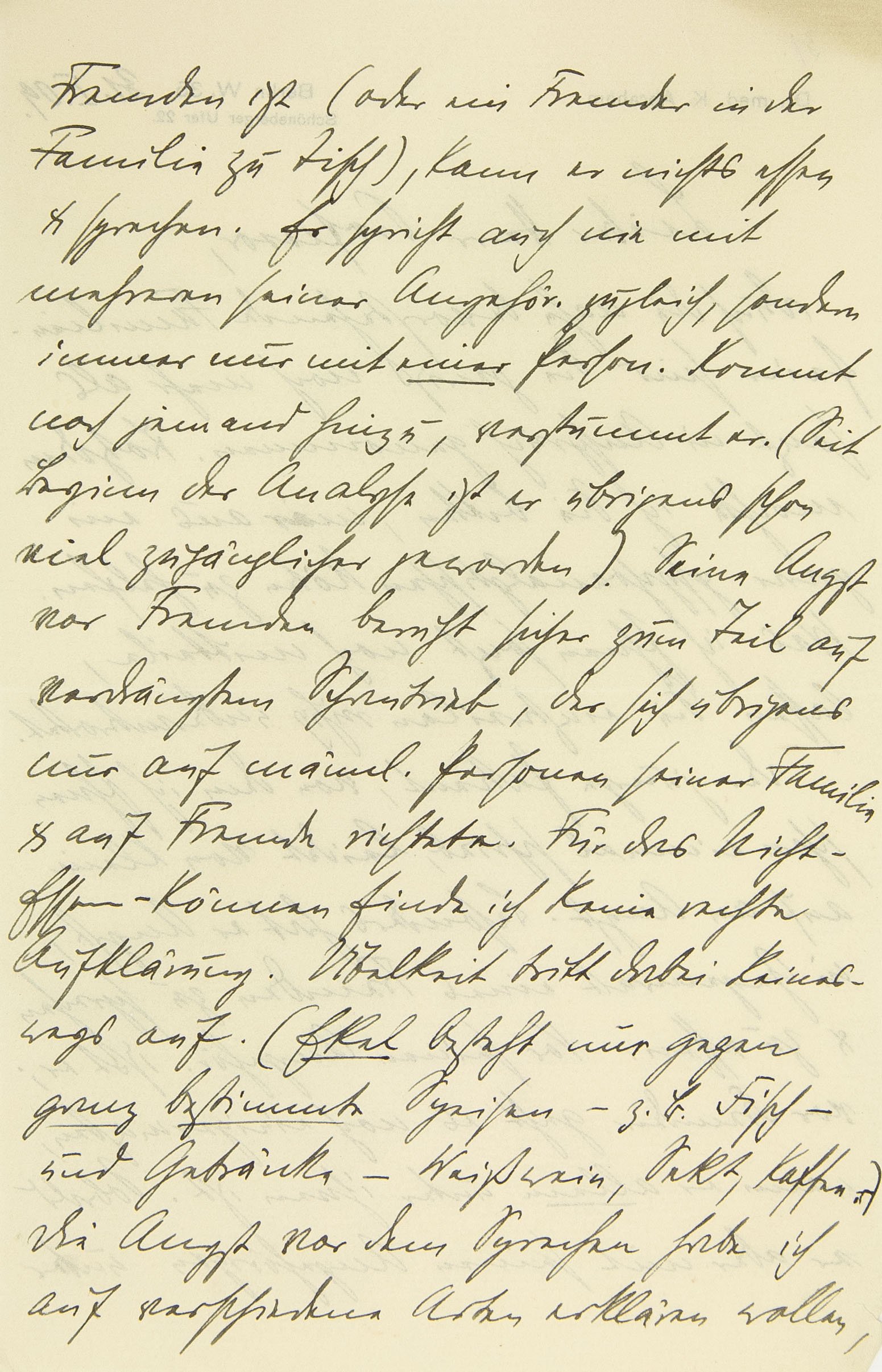 Durch die nahe bevorstehende Familienfeier sind Sie gewiß noch mehr als sonst in Anspruch genommen. Trotzdem möchte ich Sie bitten, mir aus ein paar psychoanalytischen Nöten zu helfen. Was ich Ihnen sonst noch mitteile, lassen Sie einstweilen ruhig unbeantwortet. Der junge Patient, von dem ich Ihnen schon einmal schrieb, leidet von klein auf an Angst. Besonders hat er Angst, in Gegenwart eines Fremden zu sprechen und zu essen. Vor seinen Angehörigen ißt er; vor Freunden geht es noch einigermaßen, wenn er allein unter ihnen ist. Sobald er aber mit seinen Angehörigen unter