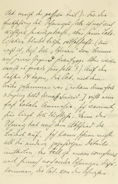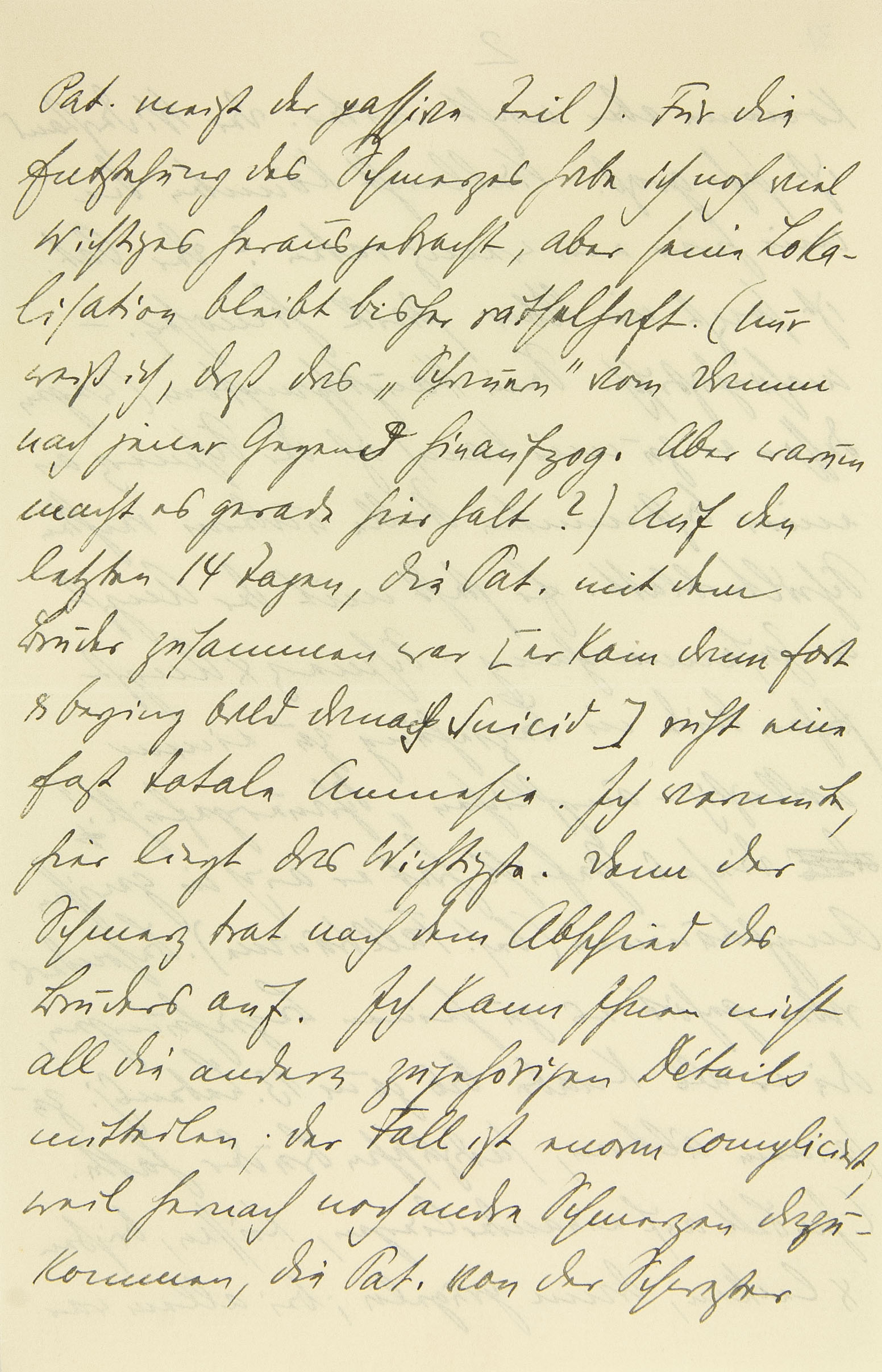 Pat. meist der passive Teil.) Für die Entstehung des Schmerzes habe ich noch viel Wichtiges herausgebracht, aber seine Lokalisation bleibt bisher rätselhaft. (Nur weiß ich, daß das »Schauern« vom Damm nach jener Gegend hinaufzog. Aber warum macht es gerade hier halt?) Auf den letzten 14 Tagen, die Pat. mit dem Bruder zusammen war (er kam dann fort und beging bald danach Suizid), ruht eine fast totale Amnesie. Ich vermute, hier liegt das Wichtigste. Denn der Schmerz trat nach dem Abschied des Bruders auf. Ich kann Ihnen nicht all die andern zugehörigen Details mitteilen; der Fall ist enorm kompliziert, weil hernach noch andre Schmerzen dazu kommen, die Pat. von der Schwester