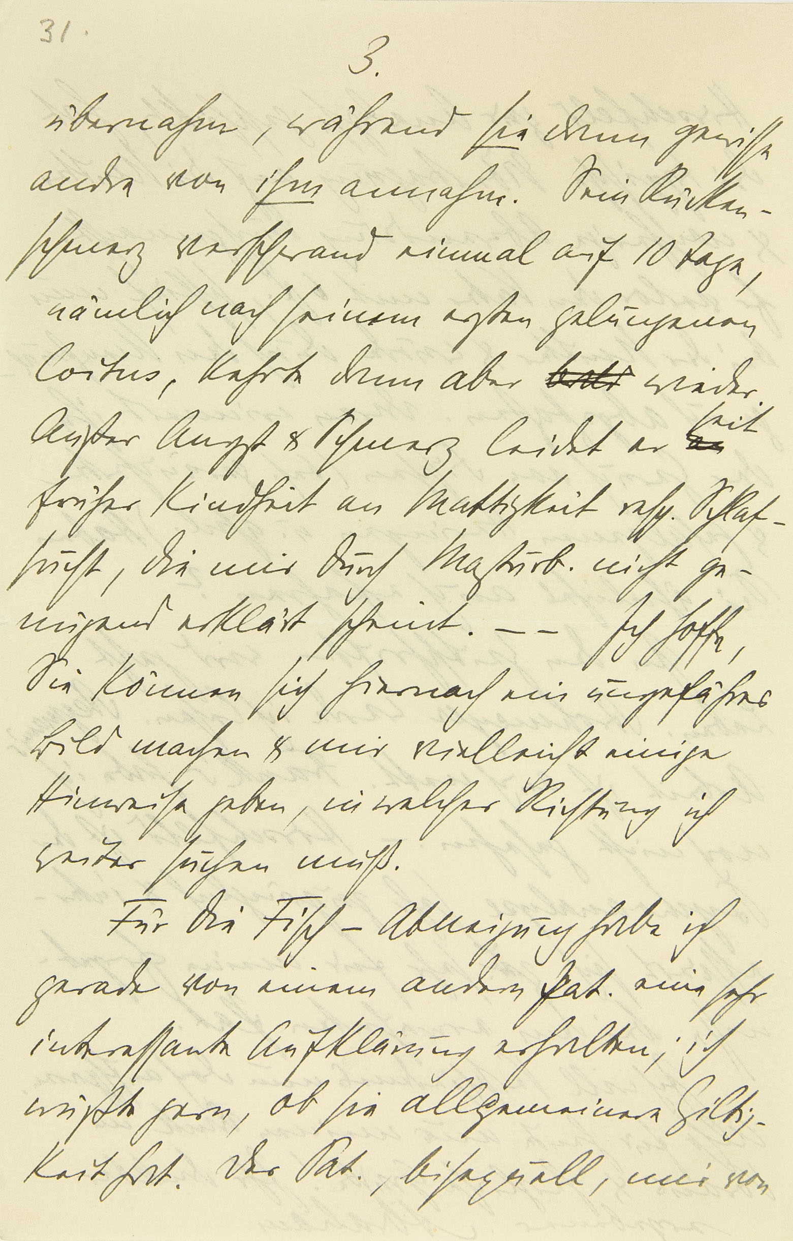 übernahm, während sie dann gewisse andre von ihm annahm. Sein Rückenschmerz verschwand einmal auf zehn Tage, nämlich nach seinem ersten gelungenen Koitus, kehrte dann aber wieder. Außer Angst und Schmerz leidet er seit früher Kindheit an Mattigkeit resp. Schlafsucht, die mir durch Masturbation nicht genügend erklärt scheint. – Ich hoffe, Sie können sich hiernach ein ungefähres Bild machen und mir vielleicht einige Hinweise geben, in welcher Richtung ich weiter suchen muß. Für die Fisch-Abneigung habe ich gerade von einem andern Pat. eine sehr interessante Aufklärung erhalten; ich wüßte gern, ob sie allgemeinere Gültigkeit hat. Der Pat., bisexuell, mir von