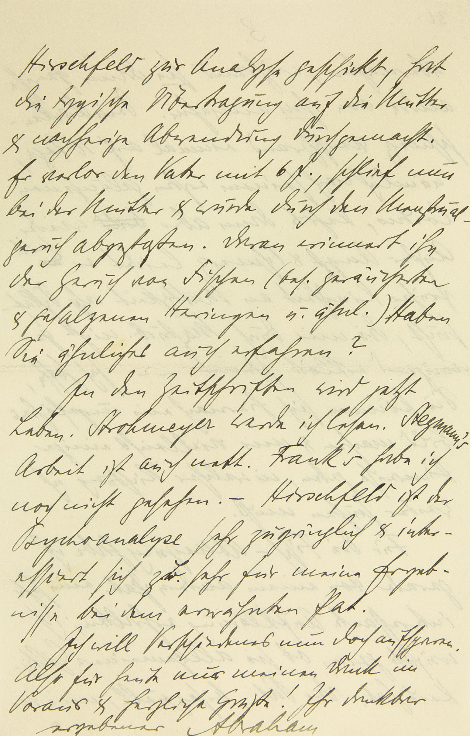 Hirschfeld zur Analyse geschickt, hat die typische Übertragung auf die Mutter und nachherige Abwendung durchgemacht. Er verlor den Vater mit sechs Jahren, schlief nun bei der Mutter und wurde durch den Menstrualgeruch abgestoßen. Daran erinnert ihn der Geruch von Fischen (besonders geräucherten und gesalzenen Heringen u. ähnl.). Haben Sie Ähnliches auch erfahren? In den Zeitschriften wird jetzt Leben. Strohmayer werde ich lesen. Stegmanns Arbeit ist auch nett. Franks habe ich noch nicht gesehen. – Hirschfeld ist der Psychoanalyse sehr zugänglich und interessiert sich z.B. sehr für meine Ergebnisse bei dem erwähnten Pat. Ich will Verschiedenes nun doch aufsparen. Also für heute nur meinen Dank im voraus und herzliche Grüße! Ihr dankbar