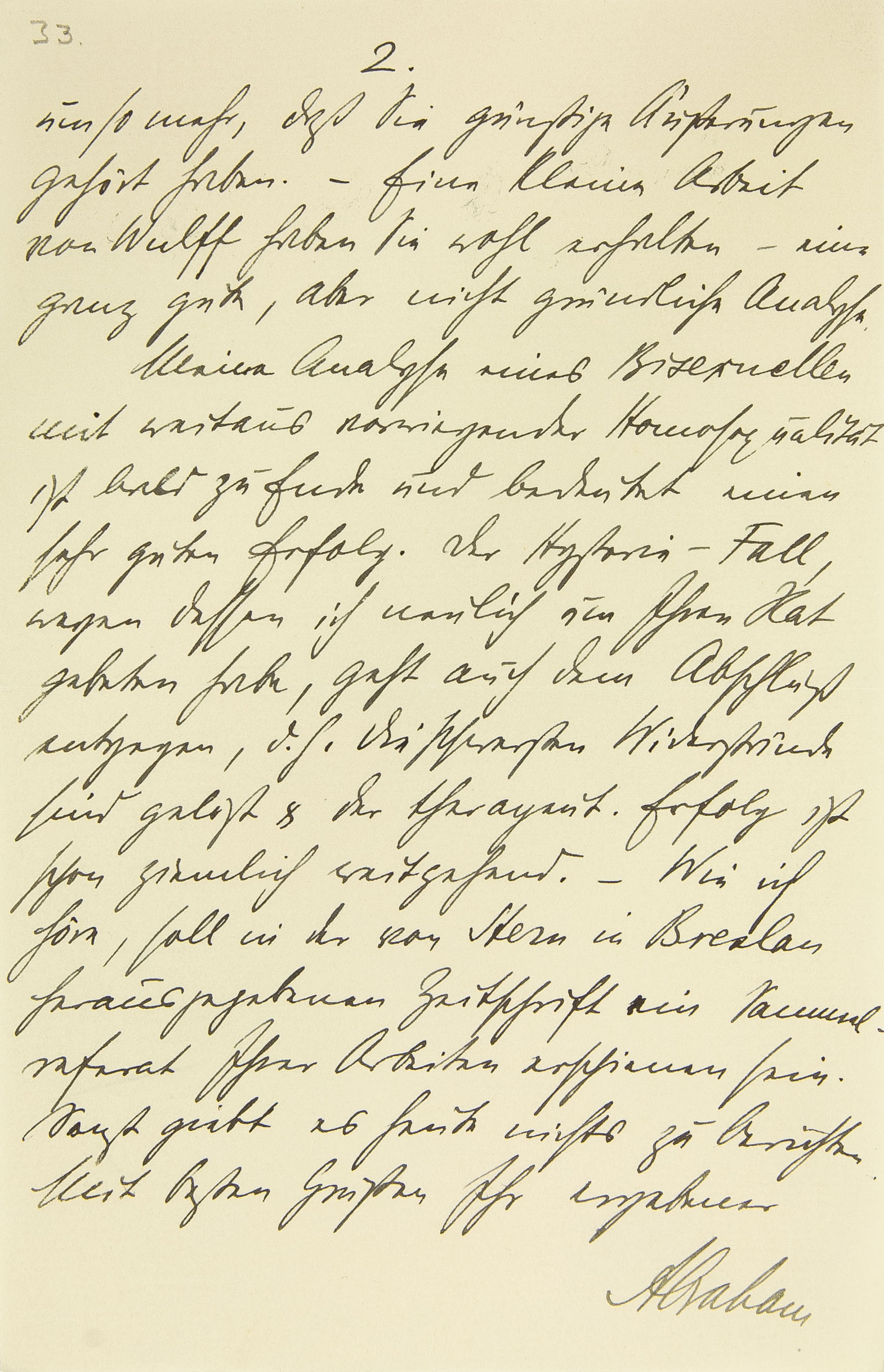 umso mehr, daß Sie günstige Äußerungen gehört haben. – Eine kleine Arbeit von Wulff haben Sie wohl erhalten – eine ganz gute, aber nicht gründliche Analyse. Meine Analyse eines Bisexuellen mit weitaus vorwiegender Homosexualität ist bald zu Ende und bedeutet einen sehr guten Erfolg. Der Hysterie-Fall, wegen dessen ich neulich um Ihren Rat gebeten habe, geht auch dem Abschluß entgegen, d.h. die schwersten Widerstände sind gelöst und der therapeutische Erfolg ist schon ziemlich weitgehend. – Wie ich höre, soll in der von Stern in Breslau herausgegebenen Zeitschrift ein Sammelreferat Ihrer Arbeiten erschienen sein. Sonst gibt es heute nichts zu berichten. Mit besten Grüßen Ihr ergebener