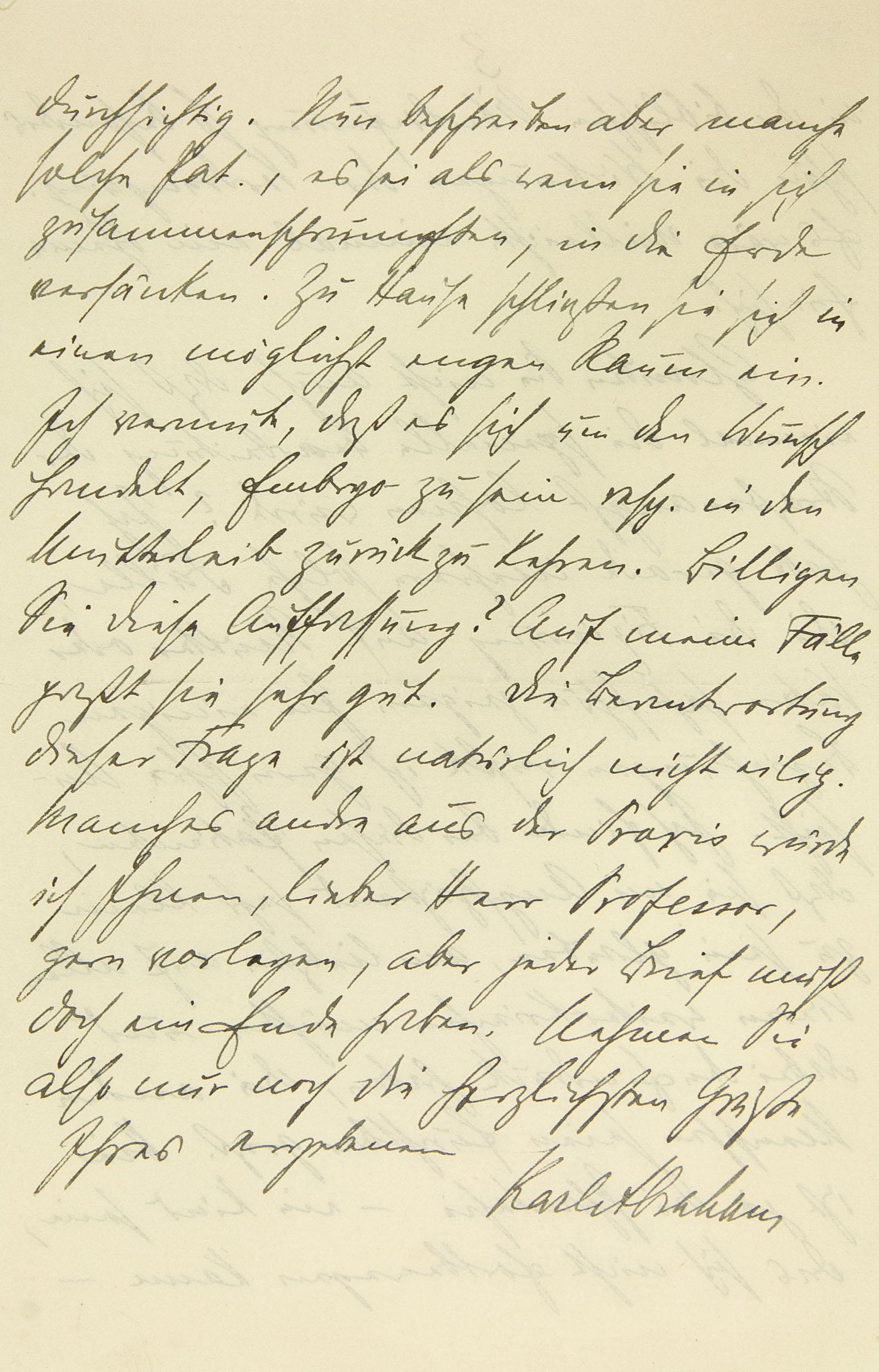 durchsichtig. Nun beschreiben aber manche solche Pat., es sei, als wenn sie in sich zusammenschrumpften, in die Erde versänken. Zu Hause schließen sie sich in einen möglichst engen Raum ein. Ich vermute, daß es sich um den Wunsch handelt, Embryo zu sein resp. in den Mutterleib zurückzukehren. Billigen Sie diese Auffassung? Auf meine Fälle paßt sie sehr gut. Die Beantwortung dieser Frage ist natürlich nicht eilig. Manches andre aus der Praxis würde ich Ihnen, lieber Herr Professor, gern vorlegen, aber jeder Brief muß doch ein Ende haben. Nehmen Sie also nur noch die herzlichsten Grüße Ihres ergebenen