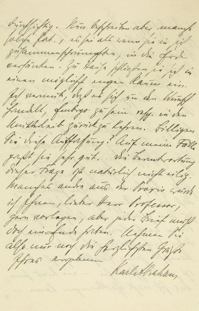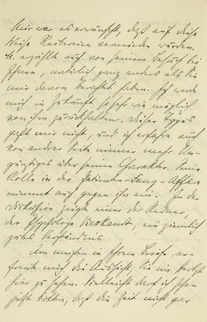 Mir war es erwünscht, daß auf diese Weise Reibereien vermieden wurden. M. erzählte auch von seinem Besuch bei Ihnen, natürlich ganz anders, als Sie mir davon berichtet haben. Ich werde mich in Zukunft so sehr wie möglich von ihm zurückhalten. Dieser Typus paßt mir nicht, und ich erfahre auch von andrer Seite immer mehr Ungünstiges über seinen Charakter. Seine Rolle in der Patienten- Fang-Affäre nimmt auch gegen ihn ein. In der Diskussion zeigte einer der Redner, der Psychologe Vierkandt, ein ziemlich gutes Verständnis. Am meisten in Ihrem Briefe erfreute mich die Aussicht, Sie im Herbst hier zu sehen. Vielleicht darf ich schon jetzt bitten, daß die Zeit nicht gar