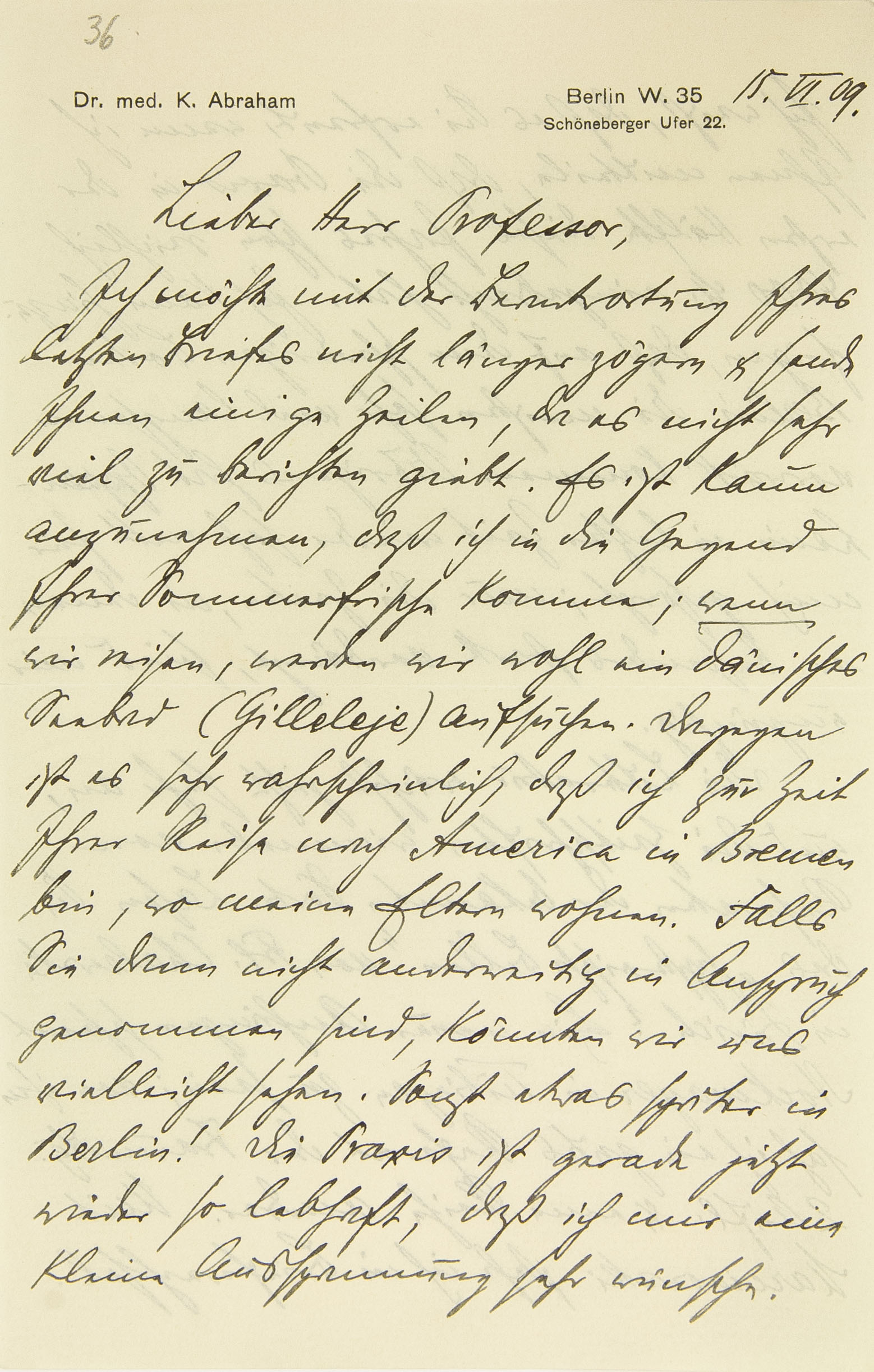 Ich möchte mit der Beantwortung Ihres letzten Briefes nicht länger zögern und sende Ihnen einige Zeilen, da es nicht sehr viel zu berichten gibt. Es ist kaum anzunehmen, daß ich in die Gegend Ihrer Sommerfrische komme; wenn wir reisen, werden wir wohl ein dänisches Seebad (Gilleleje) aufsuchen. Dagegen ist es sehr wahrscheinlich, daß ich zur Zeit Ihrer Reise nach Amerika in Bremen bin, wo meine Eltern wohnen. Falls Sie dann nicht anderweitig in Anspruch genommen sind, könnten wir uns vielleicht sehen. Sonst etwas später in Berlin! Die Praxis ist gerade jetzt wieder so lebhaft, daß ich mir eine kleine Ausspannung sehr wünsche.