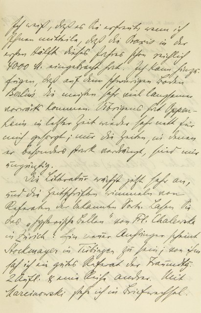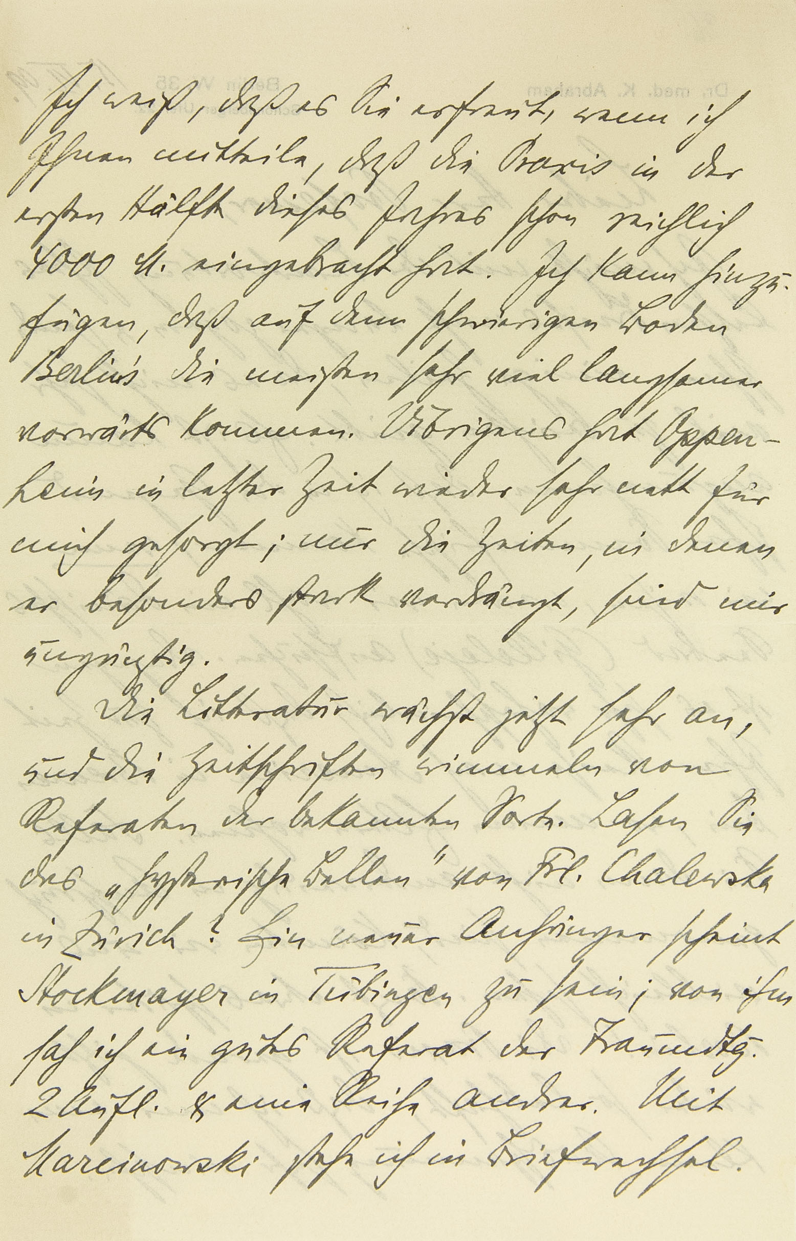 Ich weiß, daß es Sie erfreut, wenn ich Ihnen mitteile, daß die Praxis in der ersten Hälfte dieses Jahres schon reichlich 4000 M. eingebracht hat. Ich kann hinzufügen, daß auf dem schwierigen Boden Berlins die meisten sehr viel langsamer vorwärts kommen. Übrigens hat Oppenheim in letzter Zeit wieder sehr nett für mich gesorgt; nur die Zeiten, in denen er besonders stark verdrängt, sind mir ungünstig. Die Literatur wächst jetzt sehr an, und die Zeitschriften wimmeln von Referaten der bekannten Sorte. Lasen Sie das »Hysterische Bellen« von Frl. Chalewska in Zürich? Ein neuer Anhänger scheint Stockmayer in Tübingen zu sein; von ihm sah ich ein gutes Referat der Traumdeutung, zweite Auflage, und eine Reihe andrer. Mit Marcinowski stehe ich in Briefwechsel.
