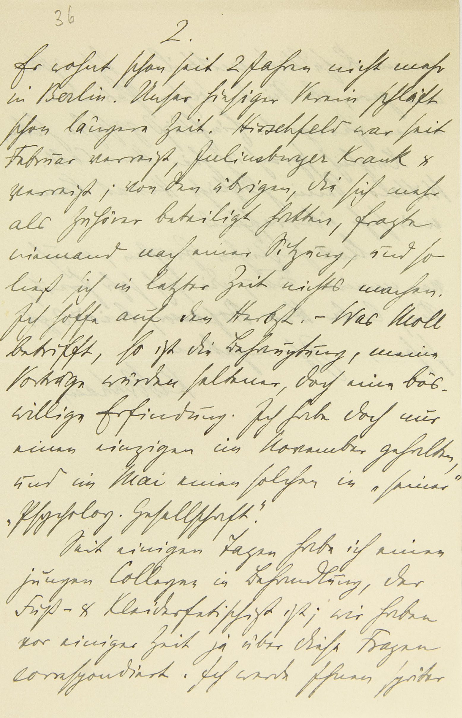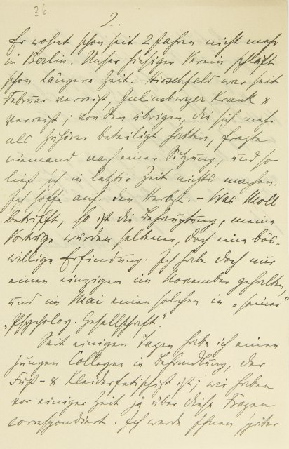 Er wohnt schon seit zwei Jahren nicht mehr in Berlin. Unser hiesiger Verein schläft schon längere Zeit. Hirschfeld war seit Februar verreist, Juliusburger krank und verreist; von den übrigen, die sich mehr als Zuhörer beteiligt hatten, fragte niemand nach einer Sitzung, und so ließ sich in letzter Zeit nichts machen. Ich hoffe auf den Herbst. – Was Moll betrifft, so ist die Behauptung, meine Vorträge würden seltener, doch eine böswillige Erfindung. Ich habe doch nur einen einzigen im November gehalten, und im Mai einen solchen in »seiner« »Psychologischen Gesellschaft«. Seit einigen Tagen habe ich einen jungen Kollegen in Behandlung, der Fuß- und Kleiderfetischist ist; wir haben vor einiger Zeit ja über diese Fragen korrespondiert. Ich werde Ihnen später
