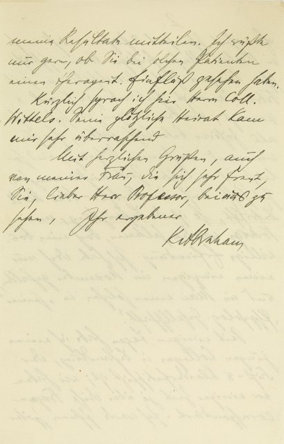 meine Resultate mitteilen. Ich wüßte nur gern, ob Sie bei solchen Patienten einen therapeutischen Einfluß gesehen haben. Kürzlich sprach ich hier Herrn Kollegen Wittels. Seine plötzliche Heirat kam mir sehr überraschend. Mit herzlichen Grüßen, auch von meiner Frau, die sich sehr freut, Sie, lieber Herr Professor, bei uns zu sehen, Ihr ergebener