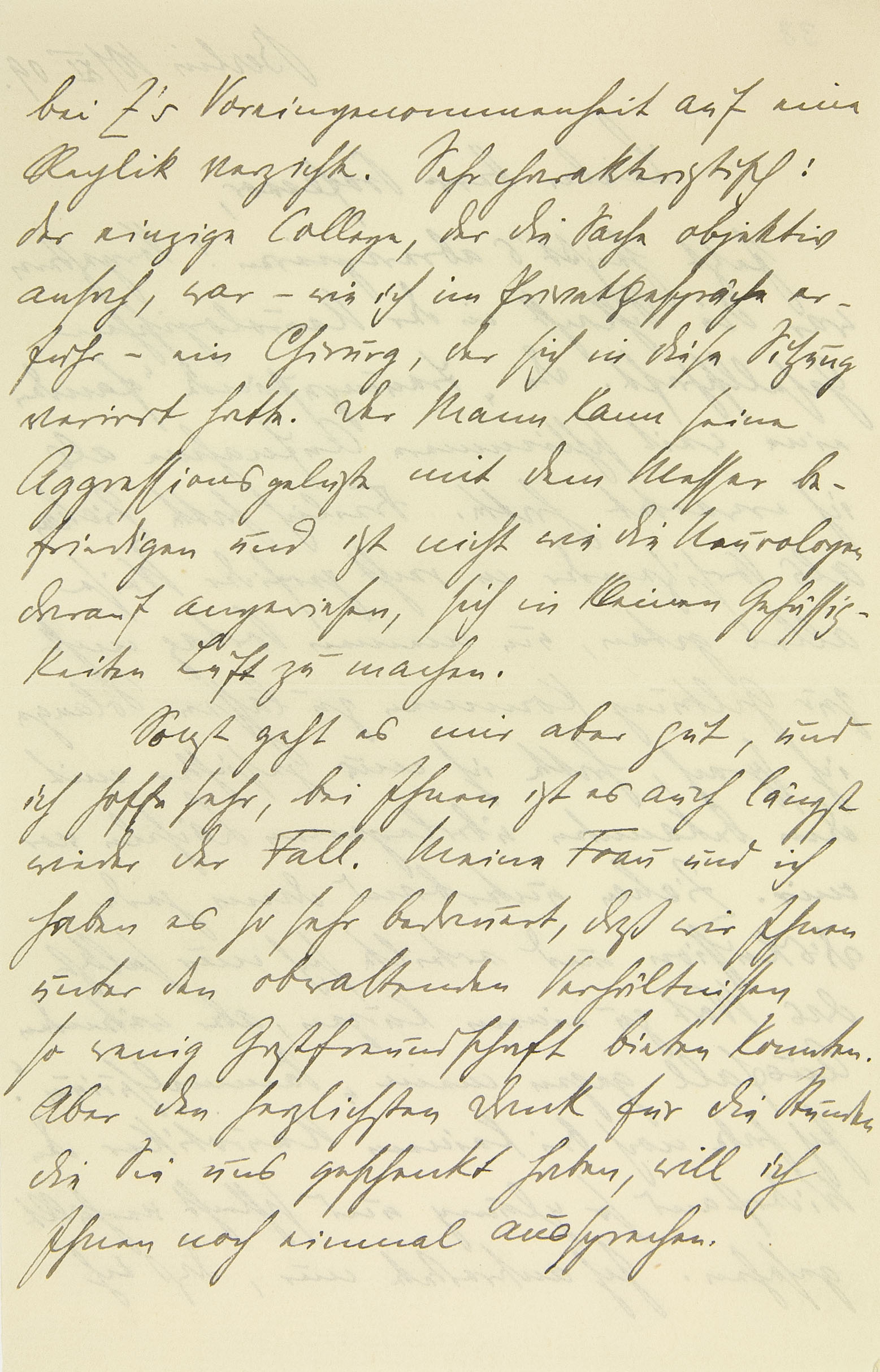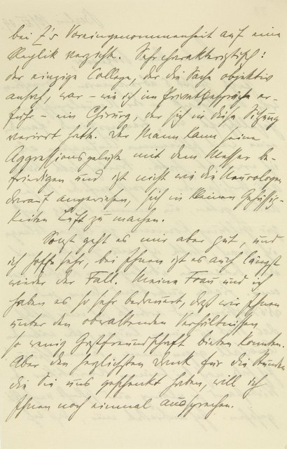 bei Z.s Voreingenommenheit auf eine Replik verzichte. Sehr charakteristisch: der einzige Kollege, der die Sache objektiv ansah, war – wie ich im Privatgespräche erfuhr – ein Chirurg, der sich in diese Sitzung verirrt hatte. Der Mann kann seine Aggressionsgelüste mit dem Messer befriedigen und ist nicht wie die Neurologen darauf angewiesen, sich in kleinen Gehässigkeiten Luft zu machen. Sonst geht es mir aber gut, und ich hoffe sehr, bei Ihnen ist es längst auch wieder der Fall. Meine Frau und ich haben es sehr bedauert, daß wir Ihnen unter den obwaltenden Verhältnissen so wenig Gastfreundschaft bieten konnten. Aber den herzlichsten Dank für die Stunden, die Sie uns geschenkt haben, will ich Ihnen noch einmal aussprechen.