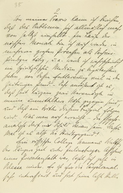 Von meiner Praxis kann ich berichten, daß das Publikum sich allmählich mehr von selbst einstellt. Im Laufe der nächsten Monate bin ich auch wieder in mehreren großen Prozessen als Sachverständiger tätig, u.a. werde ich wahrscheinlich ein spiritistisches Medium zu begutachten haben, von dessen Entlarvung viel in den Zeitungen stand. – Sehr amüsant ist es, daß seit kurzem zwei Nervenärzte in meine unmittelbare Nähe gezogen sind, und daß ein dritter diesem Beispiel folgen wird. Was man auch erreicht – die Psychoanalyse darf nie die Schuld daran sein. Dieses Mal ist es also die Stadtgegend! Ein russischer Kollege namens Wulff, der längere Zeit unter Juliusburger Assistent einer Privatanstalt war, läßt sich jetzt in Odessa nieder. Er ist für die Psychoanalyse sehr interessiert und hat seine letzte Stelle