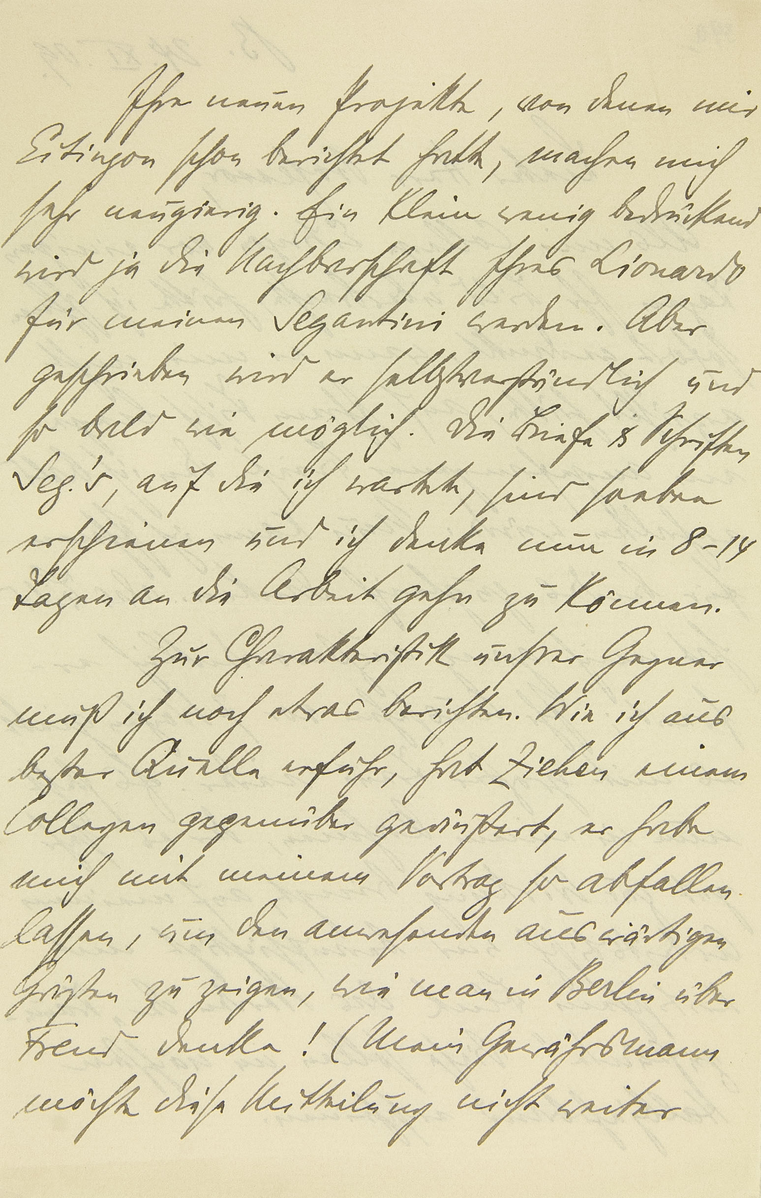 Ihre neuen Projekte, von denen mir Eitingon schon berichtet hatte, machen mich sehr neugierig. Ein klein wenig bedrückend wird ja die Nachbarschaft Ihres Leonardo für meinen Segantini werden. Aber geschrieben wird er selbstverständlich, und so bald wie möglich. Die Briefe und Schriften Segantinis, auf die ich wartete, sind soeben erschienen und ich denke nun in acht bis 14 Tagen an die Arbeit gehn zu können. Zur Charakteristik unsrer Gegner muß ich noch etwas berichten. Wie ich aus bester Quelle erfuhr, hat Ziehen einem Kollegen gegenüber geäußert, er habe mich mit meinem Vortrag so abfallen lassen, um den anwesenden auswärtigen Gästen zu zeigen, wie man in Berlin über Freud denke! (Mein Gewährsmann möchte diese Mitteilung nicht weiter