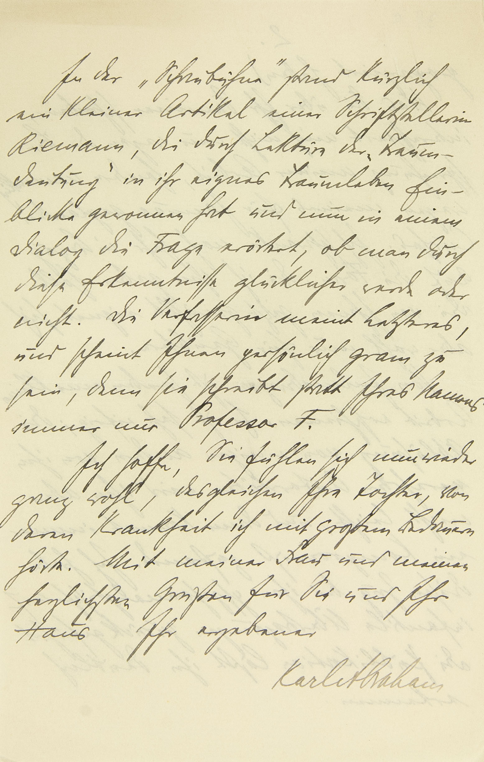 In der »Schaubühne« stand kürzlich ein kleiner Artikel einer Schriftstellerin Riemann, die durch Lektüre der »Traumdeutung« in ihr eigenes Traumleben Einblicke gewonnen hat und nun in einem Dialog die Frage erörtert, ob man durch diese Erkenntnisse glücklicher werde oder nicht. Die Verfasserin meint letzteres, und scheint Ihnen persönlich gram zu sein, denn sie schreibt statt Ihres Namens immer nur Professor F. Ich hoffe, Sie fühlen sich nun wieder ganz wohl, desgleichen Ihre Tochter, von deren Krankheit ich mit großem Bedauern hörte. Mit meiner Frau und meinen herzlichsten Grüßen für Sie und Ihr Haus, Ihr ergebener