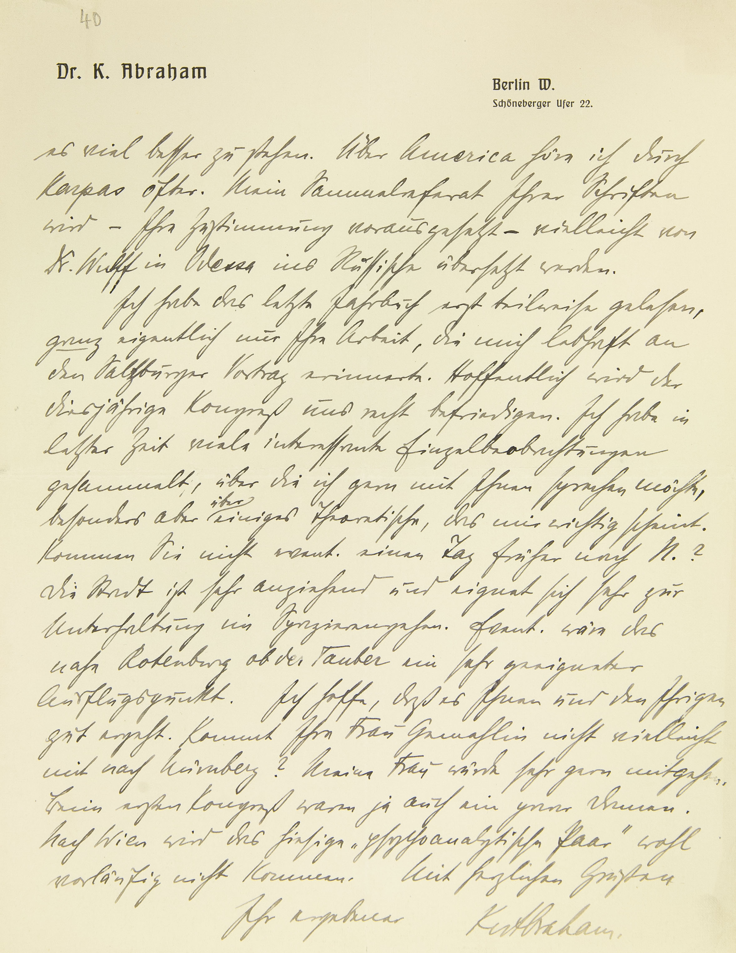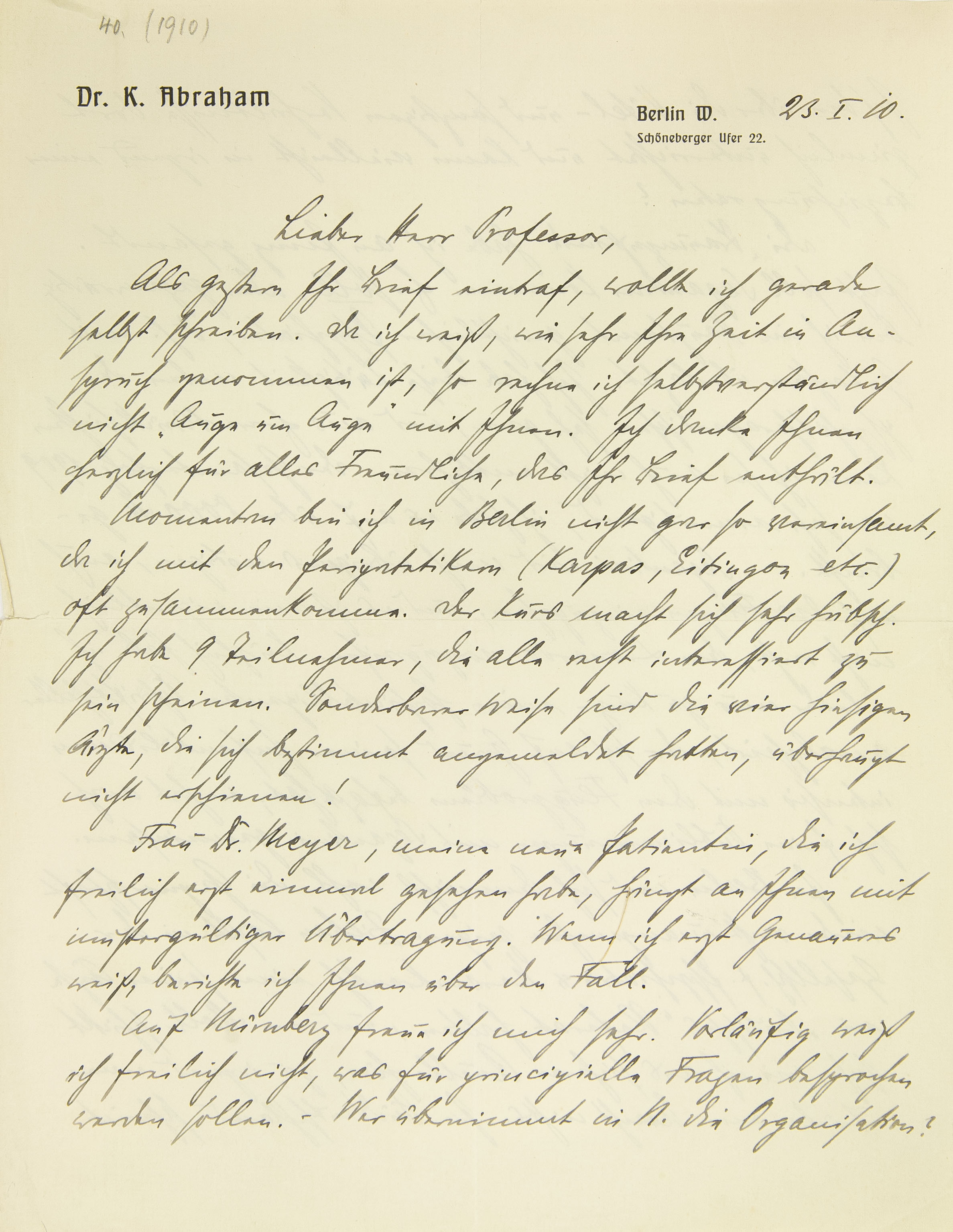Als gestern Ihr Brief eintraf, wollte ich gerade selbst schreiben. Da ich weiß, wie sehr Ihre Zeit in Anspruch genommen ist, so rechne ich selbstverständlich nicht »Auge um Auge« mit Ihnen. Ich danke Ihnen herzlich für alles Freundliche, das Ihr Brief enthält. Momentan bin ich in Berlin nicht gar so vereinsamt, da ich mit den Peripatetikern (Karpas, Eitingon etc.) oft zusammenkomme. Der Kurs macht sich sehr hübsch. Ich habe neun Teilnehmer, die alle recht interessiert zu sein scheinen. Sonderbarerweise sind die vier hiesigen Ärzte, die sich bestimmt angemeldet hatten, überhaupt nicht erschienen! Frau Dr. Meyer, meine neue Patientin, die ich freilich erst einmal gesehen habe, hängt an Ihnen mit mustergültiger Übertragung. Wenn ich erst Genaueres weiß, berichte ich Ihnen über den Fall. Auf Nürnberg freue ich mich sehr. Vorläufig weiß ich freilich nicht, was für prinzipielle Fragen besprochen werden sollen. – Wer übernimmt in N. die Organisation?