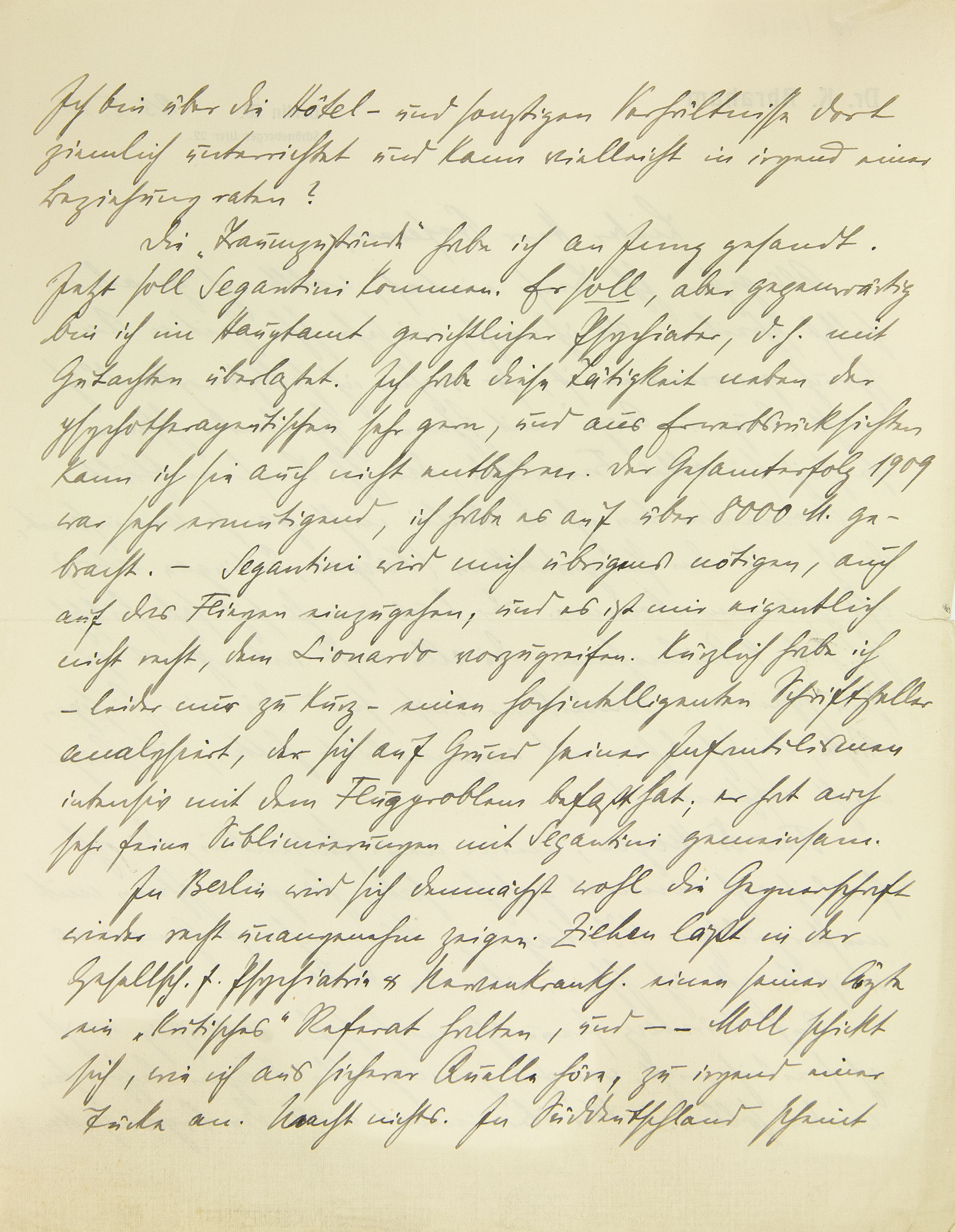 Ich bin über die Hotel- und sonstigen Verhältnisse dort ziemlich unterrichtet und kann vielleicht in irgendeiner Beziehung raten? Die »Traumzustände« habe ich an Jung gesandt. Jetzt soll Segantini kommen. Er soll, aber gegenwärtig bin ich im Hauptamt gerichtlicher Psychiater, d.h. mit Gutachten überlastet. Ich habe diese Tätigkeit neben der psychotherapeutischen sehr gern, und aus Erwerbsrücksichten kann ich sie auch nicht entbehren. Der Gesamterfolg 1909 war sehr ermutigend, ich habe es auf über 8000 M. gebracht. – Segantini wird mich übrigens nötigen, auch auf das Fliegen einzugehen, und es ist mir eigentlich nicht recht, dem Leonardo vorzugreifen. Kürzlich habe ich – leider nur zu kurz – einen hochintelligenten Schriftsteller analysiert, der sich aufgrund seiner Infantilismen intensiv mit dem Flugproblem befaßt hat; er hat auch sehr feine Sublimierungen mit Segantini gemeinsam. In Berlin wird sich demnächst wohl die Gegnerschaft wieder recht unangenehm zeigen. Ziehen läßt in der Gesellschaft für Psychiatrie und Nervenkrankheiten einen seiner Ärzte ein »kritisches« Referat halten, und – Moll schickt sich, wie ich aus sicherer Quelle höre, zu irgendeiner Tücke an. Macht nichts. In Süddeutschland scheint