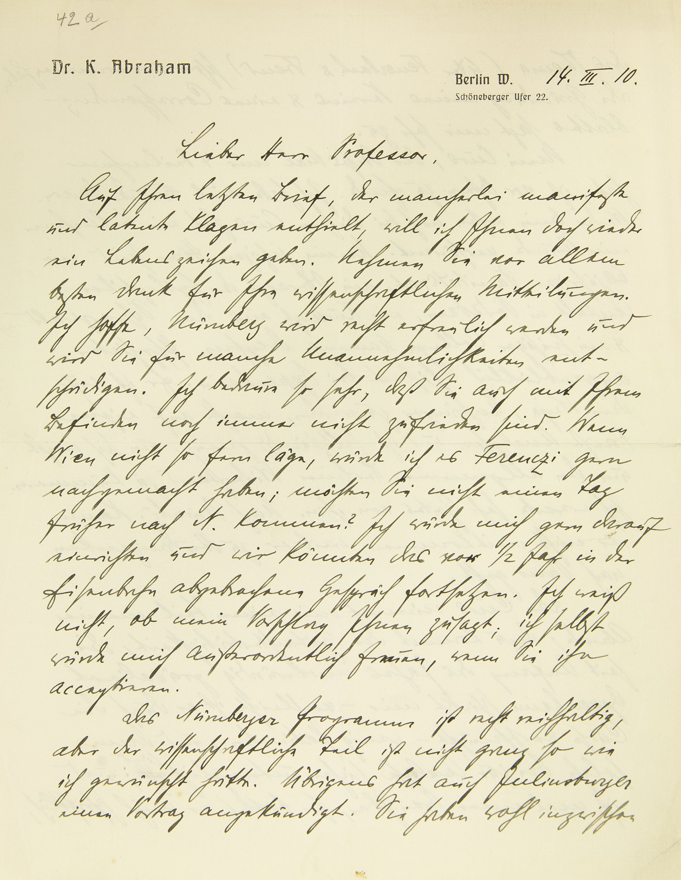 Auf Ihren letzten Brief, der mancherlei manifeste und latente Klagen enthielt, will ich Ihnen doch wieder ein Lebenszeichen geben. Nehmen Sie vor allem besten Dank für Ihre wissenschaftlichen Mitteilungen. Ich hoffe, Nürnberg wird recht erfreulich werden und wird Sie für manche Unannehmlichkeiten entschädigen. Ich bedaure so sehr, daß Sie auch mit Ihrem Befinden noch immer nicht zufrieden sind. Wenn Wien nicht so fern läge, würde ich es Ferenczi gern nachgemacht haben; möchten Sie nicht einen Tag früher nach N. kommen? Ich würde mich gern darauf einrichten und wir könnten das vor einem halben Jahr in der Eisenbahn abgebrochene Gespräch fortsetzen. Ich weiß nicht, ob mein Vorschlag Ihnen zusagt; ich selbst würde mich außerordentlich freuen, wenn sie ihn akzeptieren. Das Nürnberger Programm ist recht reichhaltig, aber der wissenschaftliche Teil ist nicht ganz so wie ich gewünscht hätte. Übrigens hat auch Juliusburger einen Vortrag angekündigt. Sie haben wohl inzwischen
