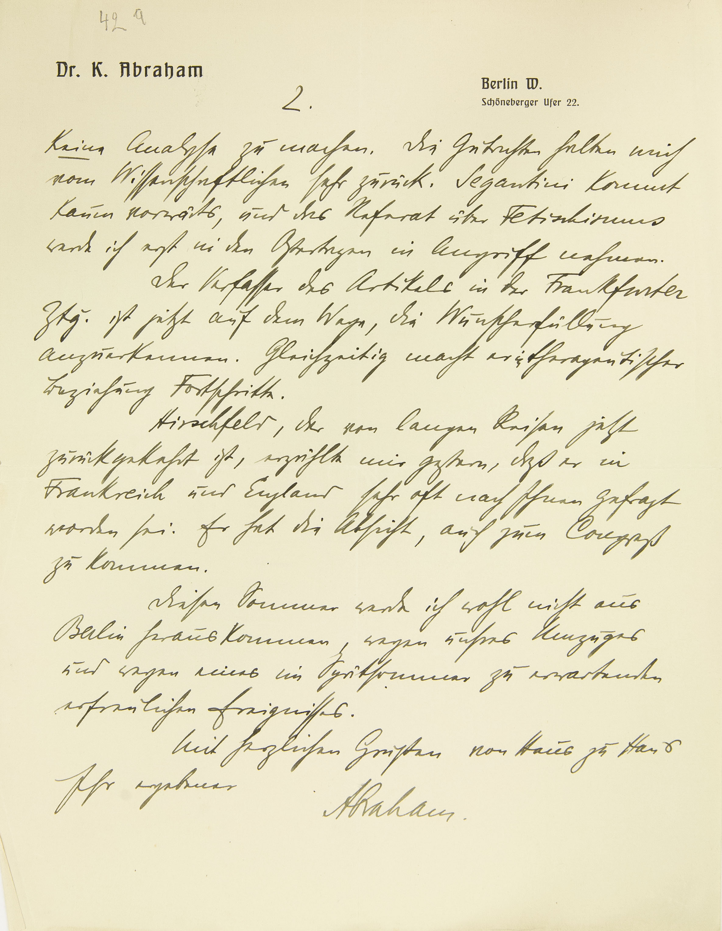 keine Analyse zu machen. Die Gutachten halten mich vom Wissenschaftlichen sehr zurück. Segantini kommt kaum vorwärts, und das Referat über Fetischismus werde ich erst in den Ostertagen in Angriff nehmen. Der Verfasser des Artikels in der Frankfurter Zeitung ist jetzt auf dem Wege, die Wunscherfüllung anzuerkennen. Gleichzeitig macht er in therapeutischer Beziehung Fortschritte. Hirschfeld, der von langen Reisen jetzt zurückkehrt ist, erzählte mir gestern, daß er in Frankreich und England sehr oft nach Ihnen gefragt worden sei. Er hat die Absicht, auch zum Kongreß zu kommen. Diesen Sommer werde ich wohl nicht aus Berlin herauskommen, wegen unsres Umzuges und wegen eines im Spätsommer zu erwartenden erfreulichen Ereignisses. Mit herzlichen Grüßen von Haus zu Haus,