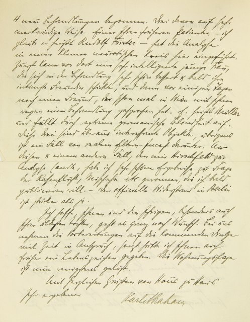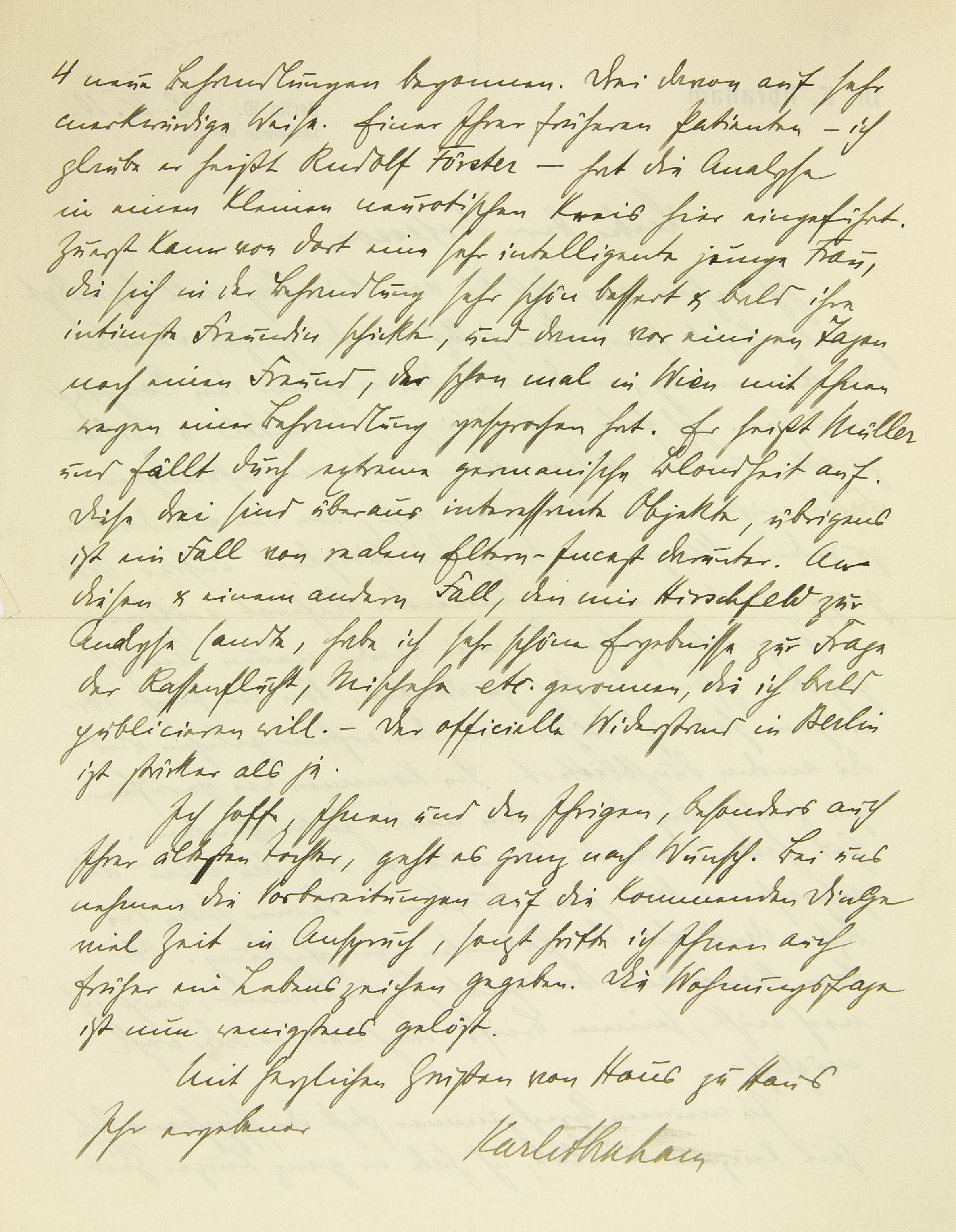 neue Behandlungen begonnen. Drei davon auf sehr merkwürdige Weise. Einer Ihrer früheren Patienten – ich glaube er heißt Rudolf Förster – hat die Analyse in einen kleinen neurotischen Kreis hier eingeführt. Zuerst kam von dort eine sehr intelligente junge Frau, die sich in der Behandlung sehr schön bessert und bald ihre intimste Freundin schickte, und dann vor einigen Tagen noch einen Freund, der schon mal in Wien mit Ihnen wegen einer Behandlung gesprochen hat. Er heißt Müller und fällt durch extreme germanische Blondheit auf. Diese drei sind überaus interessante Objekte, übrigens ist ein Fall von realem Eltern-Inzest darunter. An diesen und einem andern Fall, den mir Hirschfeld zur Analyse sandte, habe ich sehr schöne Ergebnisse zur Frage der Rassenflucht, Mischehe etc. gewonnen, die ich bald publizieren will. – Der offizielle Widerstand in Berlin ist stärker als je. Ich hoffe, Ihnen und den Ihrigen, besonders auch Ihrer ältesten Tochter, geht es ganz nach Wunsch. Bei uns nehmen die Vorbereitungen auf die kommenden Dinge viel Zeit in Anspruch, sonst hätte ich Ihnen auch früher ein Lebenszeichen gegeben. Die Wohnungsfrage ist nun wenigstens gelöst. Mit herzlichen Grüßen von Haus zu Haus