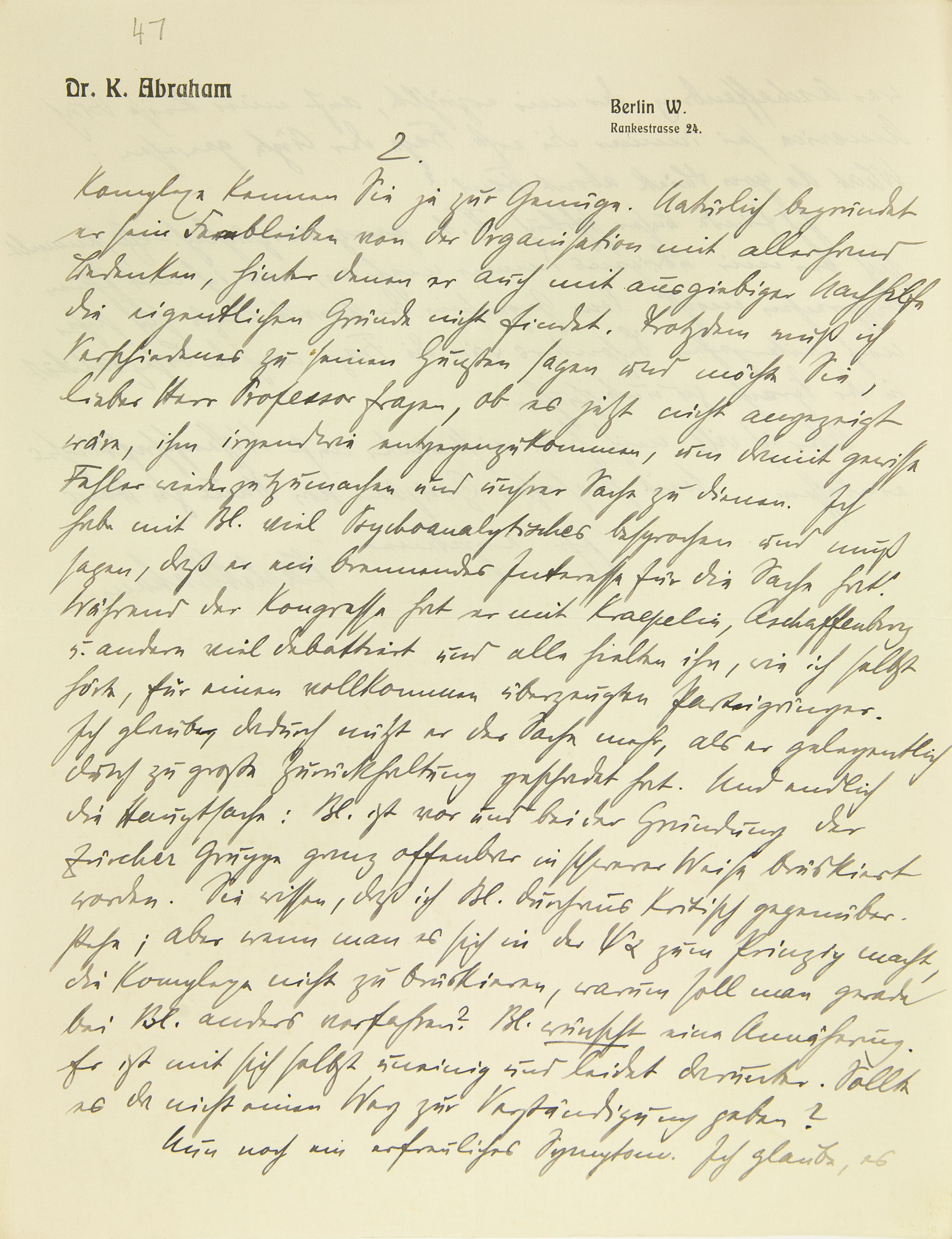 Komplexe kennen Sie ja zur Genüge. Natürlich begründet er sein Fernbleiben von der Organisation mit allerhand Bedenken, hinter denen er auch mit ausgiebiger Nachhilfe die eigentlichen Gründe nicht findet. Trotzdem muß ich Verschiedenes zu seinen Gunsten sagen und möchte Sie, lieber Herr Professor, fragen, ob es jetzt nicht angezeigt wäre, ihm irgendwie entgegenzukommen, um damit gewisse Fehler wieder- gutzumachen und unsrer Sache zu dienen. Ich habe mit Bl. viel Psychoanalytisches besprochen und muß sagen, daß er ein brennendes Interesse für die Sache hat. Während der Kongresse hat er mit Kraepelin, Aschaffenburg und andern viel debattiert, und alle hielten ihn, wie ich selbst hörte, für einen vollkommen überzeugten Parteigänger. Ich glaube, dadurch nützt er der Sache mehr, als er gelegentlich durch zu große Zurückhaltung geschadet hat. Und endlich die Hauptsache: Bl. ist vor und bei der Gründung der Zürcher Gruppe ganz offenbar in schwerer Weise brüskiert worden. Sie wissen, daß ich Bl. durchaus kritisch gegenüber stehe; aber wenn man es sich in der Psychoanalyse zum Prinzip macht, die Komplexe nicht zu brüskieren, warum soll man gerade bei Bl. anders verfahren? Bl. wünscht eine Annäherung. Er ist mit sich selbst uneinig und leidet darunter. Sollte es da nicht einen Weg zur Verständigung geben? Nun noch ein erfreuliches Symptom. Ich glaube, es war