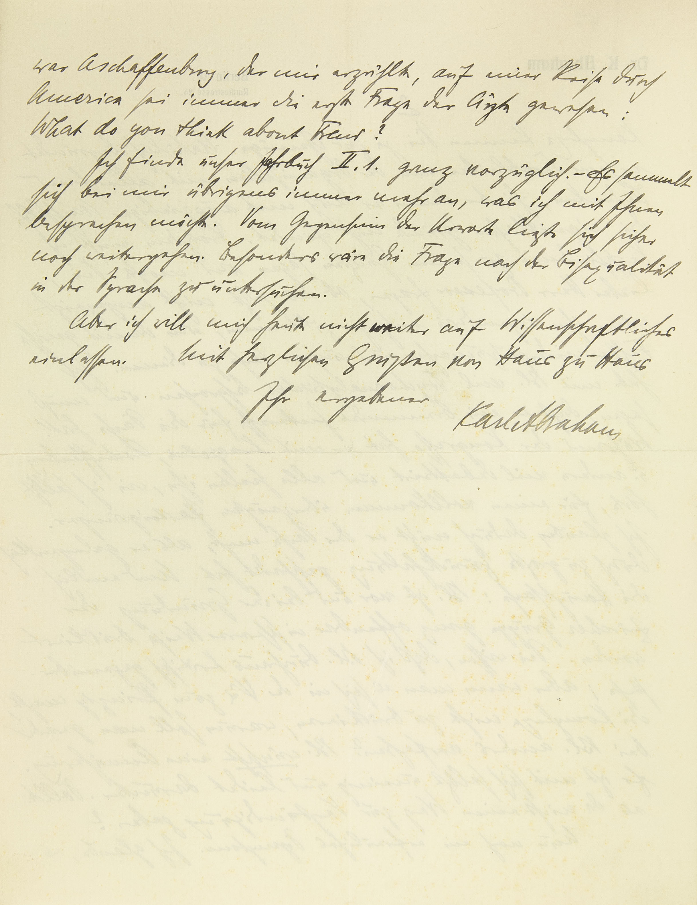 Aschaffenburg, der mir erzählte, auf einer Reise durch Amerika sei immer die erste Frage der Ärzte gewesen: What do you think about Freud? Ich finde unser Jahrbuch II.. ganz vorzüglich. – Es sammelt sich bei mir übrigens immer mehr an, was ich mit Ihnen besprechen möchte. Vom Gegensinn der Urworte ließe sich sicher noch weitergehen. Besonders wäre die Frage nach der Bisexualität in der Sprache zu untersuchen. Aber ich will mich heute nicht weiter auf Wissenschaftliches einlassen. Mit herzlichen Grüßen von Haus zu Haus