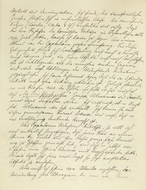 und Denunziation. Ich finde, die unerfreulichen Zeichen häufen sich in erfreulichster Weise. Wir anwesenden Ketzer (Koerber, Warda und ich) verhielten uns ruhig. Daß bei dem Festessen die komischen Vorträge im wesentlichen alle ein Ziel hatten, brauche ich kaum zu sagen. An einem Abend war bei Oppenheim großer Empfang. Bei dieser Gelegenheit stürzte sich Aschaffenburg auf mich und benutzte mich längere Zeit, um seine Affekte auf mich loszulassen. Er ist intelligenter als die mei- sten andern Gegner, und wurde nach Abklingen der Widerstände bedeutend zugänglicher. Ich kann bestimmt sagen, daß die ca. dreistündige Debatte nicht ohne Wirkung geblieben ist. Zuletzt plauderte er ein bißchen aus der Schule. Er halte es für möglich daß »die drei Psychopathen« Gaupp, Wilmanns und Isserlin eines Tages umfallen würden. Ich weiß nicht, ob er recht hat. Wilmanns wäre sehr wertvoll. Ich kenne ihn aus unsrer gemeinsamen Heimat Bremen und weiß, daß er ein unabhängig denkender Mensch ist. Was Oppenheims Widerstand betrifft, so will ich noch vertraulich hinzufügen, daß seine Frau an einer schweren Hysterie leidet und ihm dieses ganze Jahr damit arg zu schaffen gemacht hat, und daß er selbst vor zwei Jahren eine schwere Neurose mit Angstzuständen hatte. Daraus läßt sich sein neuerdings so sehr verstärkter Affekt ja verstehen. Nun muß ich Ihnen von Bleuler erzählen, der Stunden lang zum Abreagieren bei mir war. Seine