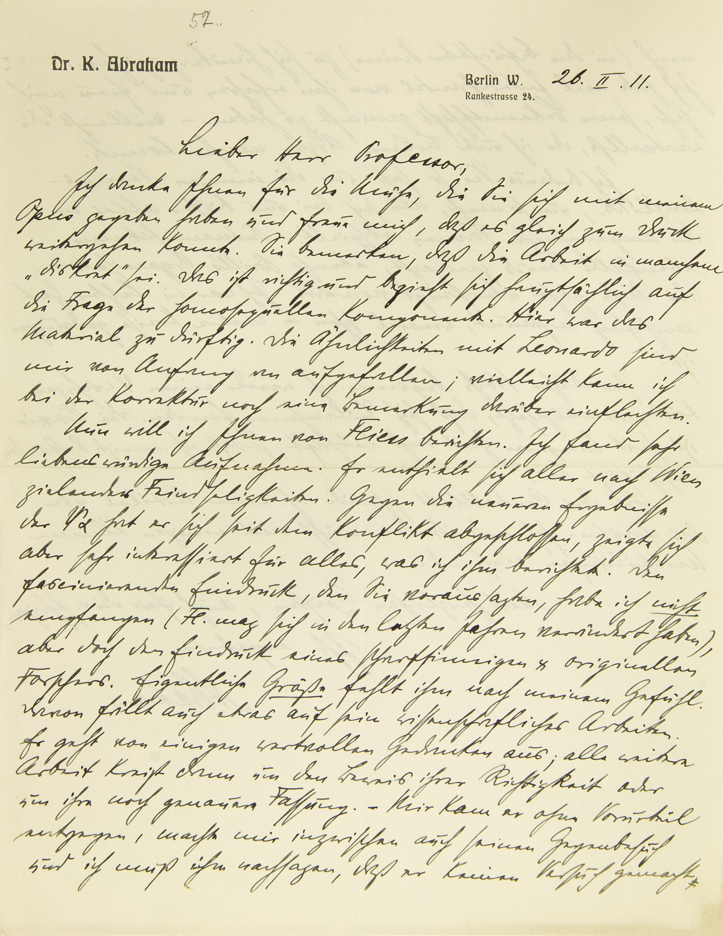 Ich danke Ihnen für die Mühe, die Sie sich mit meinem Opus gegeben haben und freue mich, daß es gleich zum Druck weitergehen konnte. Sie bemerken, daß die Arbeit in manchem »diskret« sei. Das ist richtig und bezieht sich hauptsächlich auf die Frage der homosexuellen Komponente. Hier war das Material zu dürftig. Die Ähnlichkeiten mit Leonardo sind mir von Anfang an aufgefallen; vielleicht kann ich bei der Korrektur noch eine Bemerkung darüber einflechten. Nun will ich Ihnen von Fließ berichten. Ich fand sehr liebenswürdige Aufnahme. Er enthielt sich aller nach Wien zielenden Feindseligkeiten. Gegen die neueren Ergebnisse der Psychoanalyse hat er sich seit dem Konflikt abgeschlossen, zeigte sich aber ehr interessiert für alles, was ich ihm berichtete. Den faszinierenden Eindruck, den Sie voraussagten, habe ich nicht empfangen (Fl. mag sich in den letzten Jahren verändert haben), aber doch den Eindruck eines scharfsinnigen und originellen Forschers. Eigentliche Größe fehlt ihm nach meinem Gefühl. Davon fällt auch etwas auf sein wissenschaftliches Arbeiten. Er geht von einigen wertvollen Gedanken aus; alle weitere Arbeit kreist dann um den Beweis ihrer Richtigkeit oder um ihre noch genauere Fassung. – Mir kam er ohne Vorurteil entgegen, machte mir inzwischen auch seinen Gegenbesuch, und ich muß ihm nachsagen, daß er keinen Versuch gemacht hat, mich