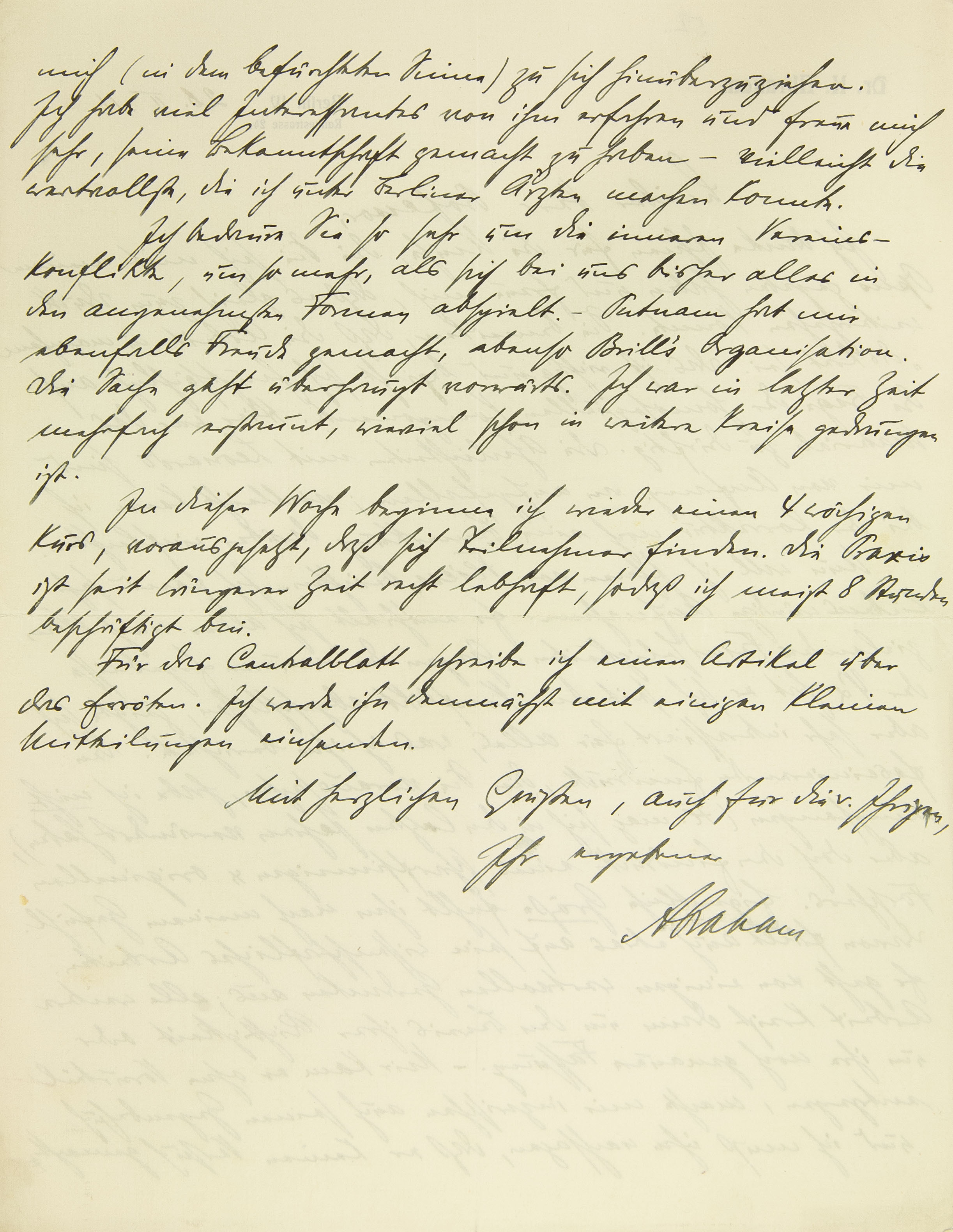 (in dem befürchteten Sinne) zu sich hinüberzuziehen. Ich habe viel Interessantes von ihm erfahren und freue mich sehr, seine Bekanntschaft gemacht zu haben – vielleicht die wertvollste, die ich unter Berliner Ärzten machen konnte. Ich bedaure Sie so sehr um die inneren Vereins-Konflikte, um so mehr, als sich bei uns bisher alles in den angenehmsten Formen abspielt. – Putnam hat mir ebenfalls Freude gemacht, ebenso Brills Organisation. Die Sache geht überhaupt vorwärts. Ich war in letzter Zeit mehrfach erstaunt, wieviel schon in weitere Kreise gedrungen ist. In dieser Woche beginne ich wieder einen vierwöchigen Kurs, vorausgesetzt, daß sich Teilnehmer finden. Die Praxis ist seit längerer Zeit recht lebhaft, sodaß ich meist acht Stunden beschäftigt bin. Für das Zentralblatt schreibe ich einen Artikel über das Erröten. Ich werde ihn demnächst mit einigen kleinen Mitteilungen einsenden. Mit herzlichen Grüßen, auch für die werten Ihrigen,